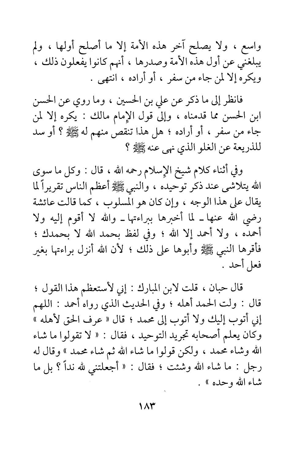 قال حبان، قلت لابن المبارك: إني لأستعظم هذا القول ; قال: ولت الحمد أهله ; وفي الحديث الذي رواه أحمد: اللهم إني أتوب إليك ولا أتوب إلى محمد ; قال: "عرف الحق لأهله" 1، وكان يعلم أصحابه تجريد التوحيد، فقال: " لا تقولوا: ما شاء الله وشاء محمد، ولكن قولوا: ما شاء الله، ثم شاء محم د" 2 وقال له رجل: ما شاء الله وشئت ; فقال: " أجعلتني لله ندا؟ بل ما شاء الله وحده " 3.