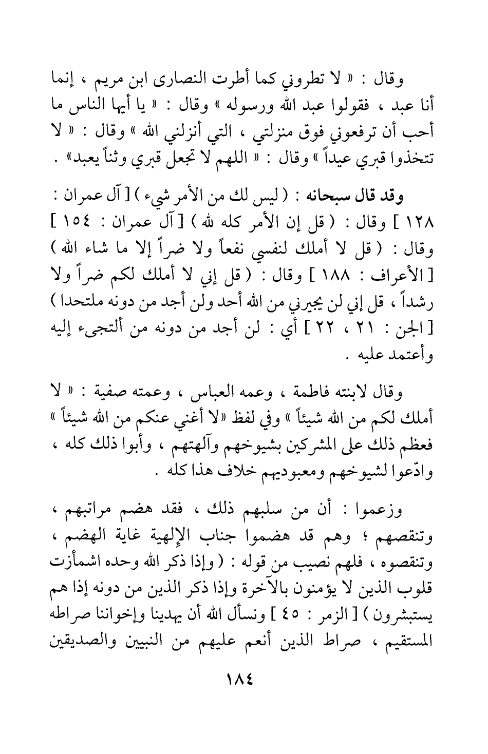 وقال لابنته فاطمة، وعمه العباس، وعمته صفية: "لا أملك لكم من الله شيئا " 5 وفي لفظ " لا أغني عنكم من الله شيئا" 6، فعظم ذلك على المشركين بشيوخهم وآلهتهم، وأبوا ذلك كله، وادعوا لشيوخهم ومعبوديهم خلاف هذا كله.
