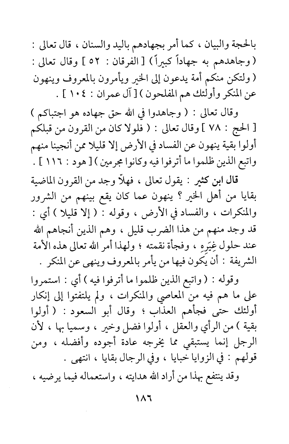 وقال تعالى: {وَجَاهِدُوا فِي اللَّهِ حَقَّ جِهَادِهِ هُوَ اجْتَبَاكُمْ} [سورة الحج آية: 78] ، وقال تعالى: {فَلَوْلا كَانَ مِنَ الْقُرُونِ مِنْ قَبْلِكُمْ أُولُو بَقِيَّةٍ يَنْهَوْنَ عَنِ الْفَسَادِ فِي الْأَرْضِ إِلَّا قَلِيلاً مِمَّنْ أَنْجَيْنَا مِنْهُمْ وَاتَّبَعَ الَّذِينَ ظَلَمُوا مَا أُتْرِفُوا فِيهِ وَكَانُوا مُجْرِمِينَ} [سورة هود آية: 116] .