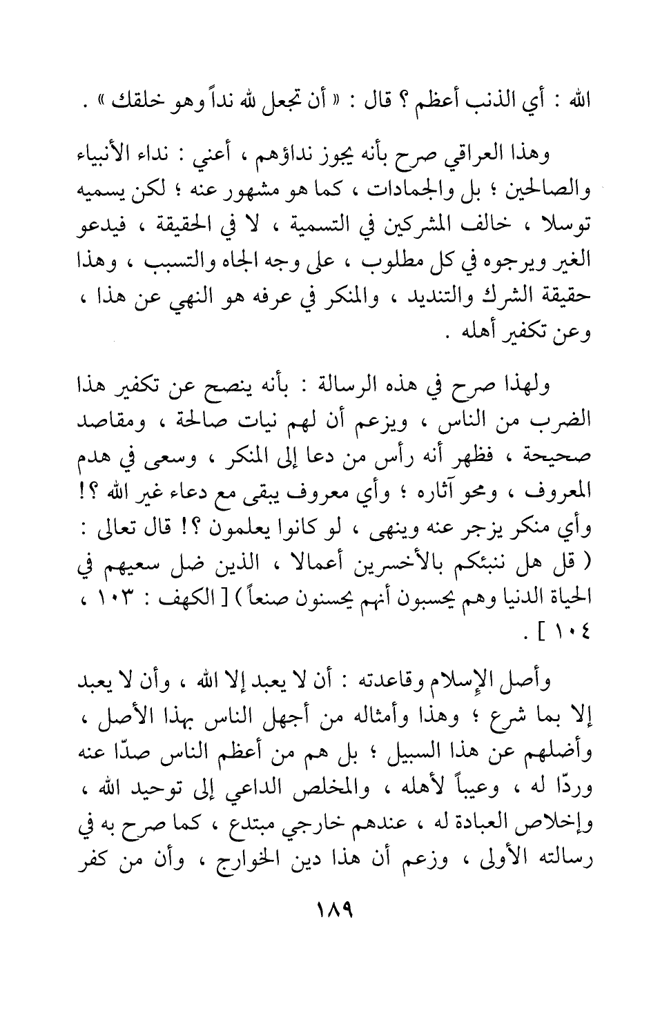 وهذا العراقي صرح بأنه يجوز نداؤهم، أعني: نداء الأنبياء والصالحين، بل والجمادات، كما هو مشهور عنه ; لكن يسميه توسلا، خالف المشركين في التسمية، لا في الحقيقة، فيدعو الغير ويرجوه في كل مطلوب، على وجه الجاه والتسبب؛ وهذا حقيقة الشرك والتنديد، والمنكر في عرفه هو النهي عن هذا، وعن تكفير أهله.