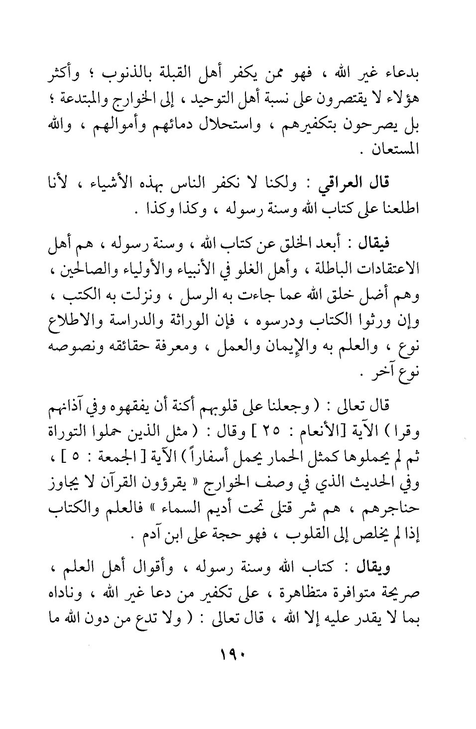 قال العراقي: ولكنا لا نكفر الناس بهذه الأشياء، لأنا اطلعنا على كتاب الله وسنة رسوله، وكذا وكذا.