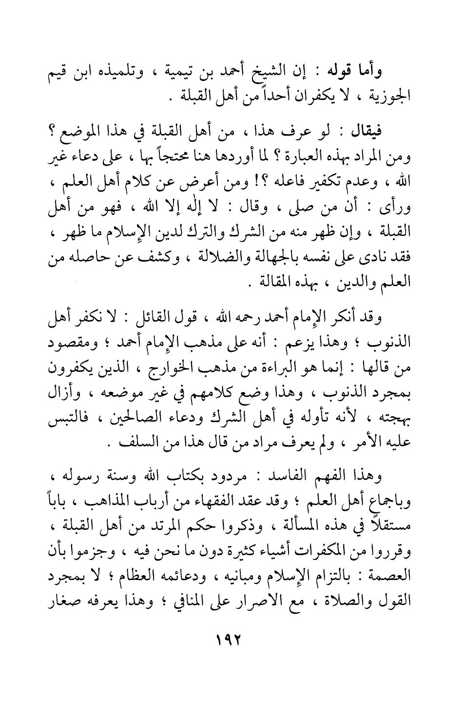وقد أنكر الإمام أحمد رحمه الله، قول القائل: لا نكفر أهل الذنوب ; وهذا يزعم أنه على مذهب الإمام أحمد ; ومقصود من قالها: إنما هو البراءة من مذهب الخوارج الذين يكفرون بمجرد الذنوب، وهذا وضع كلامهم في غير موضعه، وأزال بهجته، لأنه تأوله في أهل الشرك ودعاء الصالحين، فالتبس عليه الأمر، ولم يعرف مراد من قال هذا من السلف.