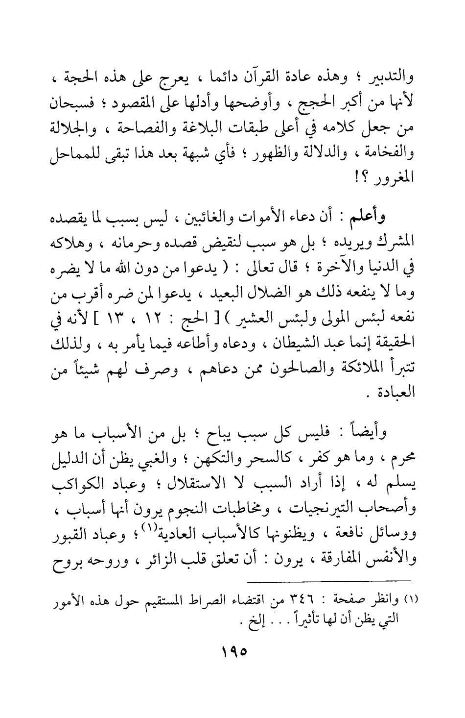 وأيضا: فليس كل سبب يباح ; بل من الأسباب ما هو محرم، وما هو كفر، كالسحر والتكهن ; والغبي يظن أن الدليل يسلم له، إذا أراد السبب لا الاستقلال ; وعباد الكواكب وأصحاب النيرنجيات، ومخاطبات النجوم يرون أنها أسباب، ووسائل نافعة، ويظنونها كالأسباب العادية 1 وعباد القبور والأنفس المفارقة، يرون أن تعلق قلب الزائر، وروحه بروح