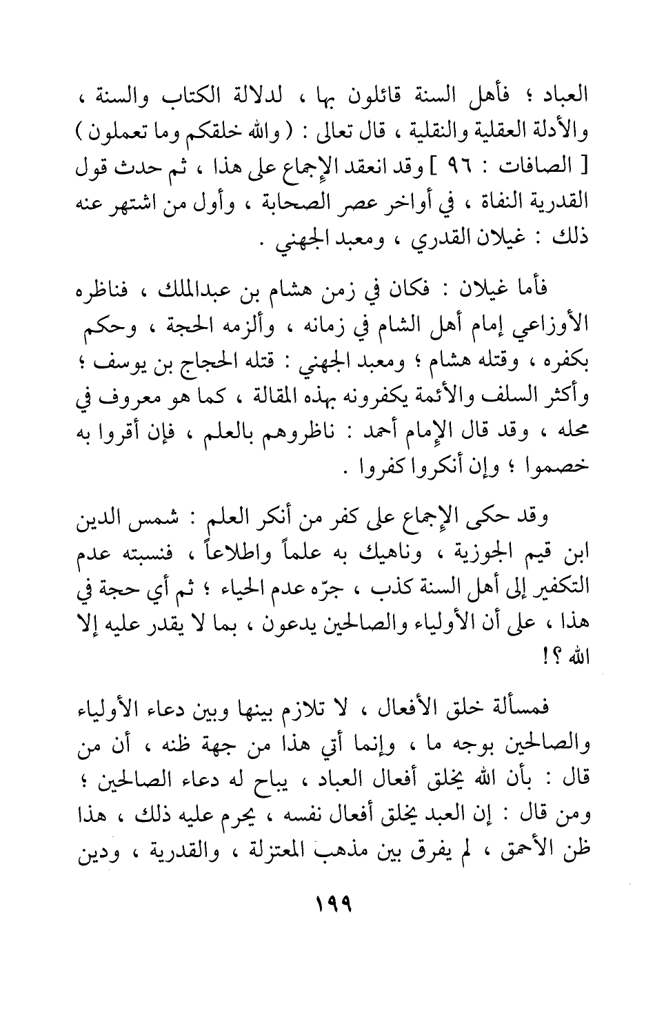 العباد، فأهل السنة قائلون بها، لدلالة الكتاب والسنة، والأدلة العقلية والنقلية، قال تعالى: {وَاللَّهُ خَلَقَكُمْ وَمَا تَعْمَلُونَ} [سورة الصافات آية: 96] ؛ وقد انعقد الإجماع على هذا. ثم حدث قول القدرية النفاة، في أواخر عصر الصحابة، وأول من اشتهر عنه ذلك: غيلان القدري، ومعبد الجهني.