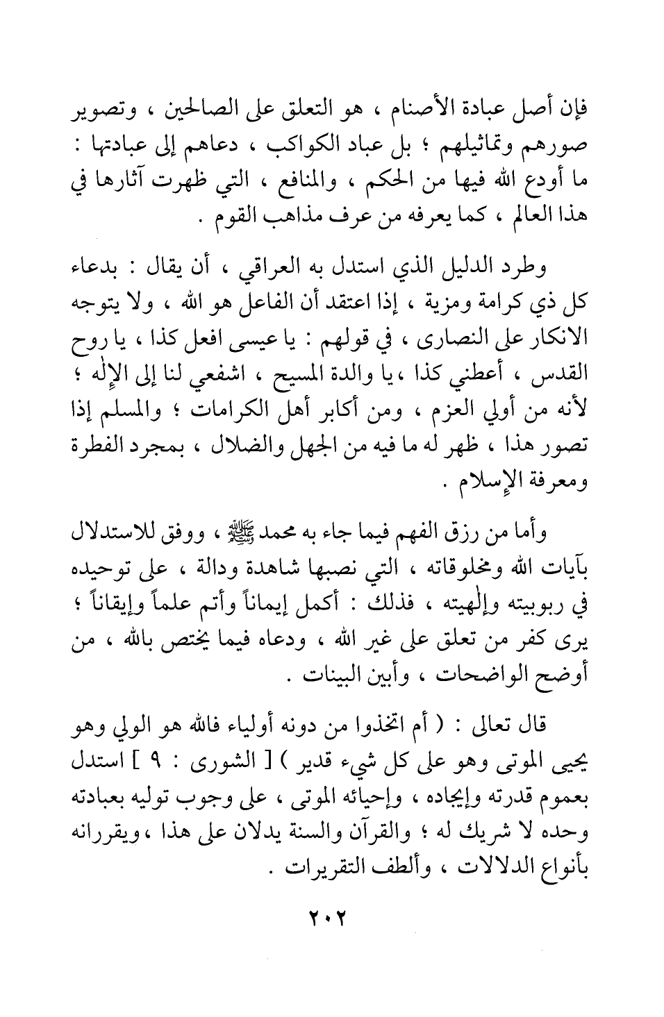 وأما من رزق الفهم فيما جاء به محمد صلى الله عليه وسلم ووفق للاستدلال بآيات الله ومخلوقاته التي نصبها شاهدة ودالة على توحيده في ربوبيته وإلهيته، فذلك أكمل إيمانا وأتم علما وإيقانا، يرى كفر من تعلق على غير الله، ودعاه فيما يختص بالله، من أوضح الواضحات، وأبين البينات.
