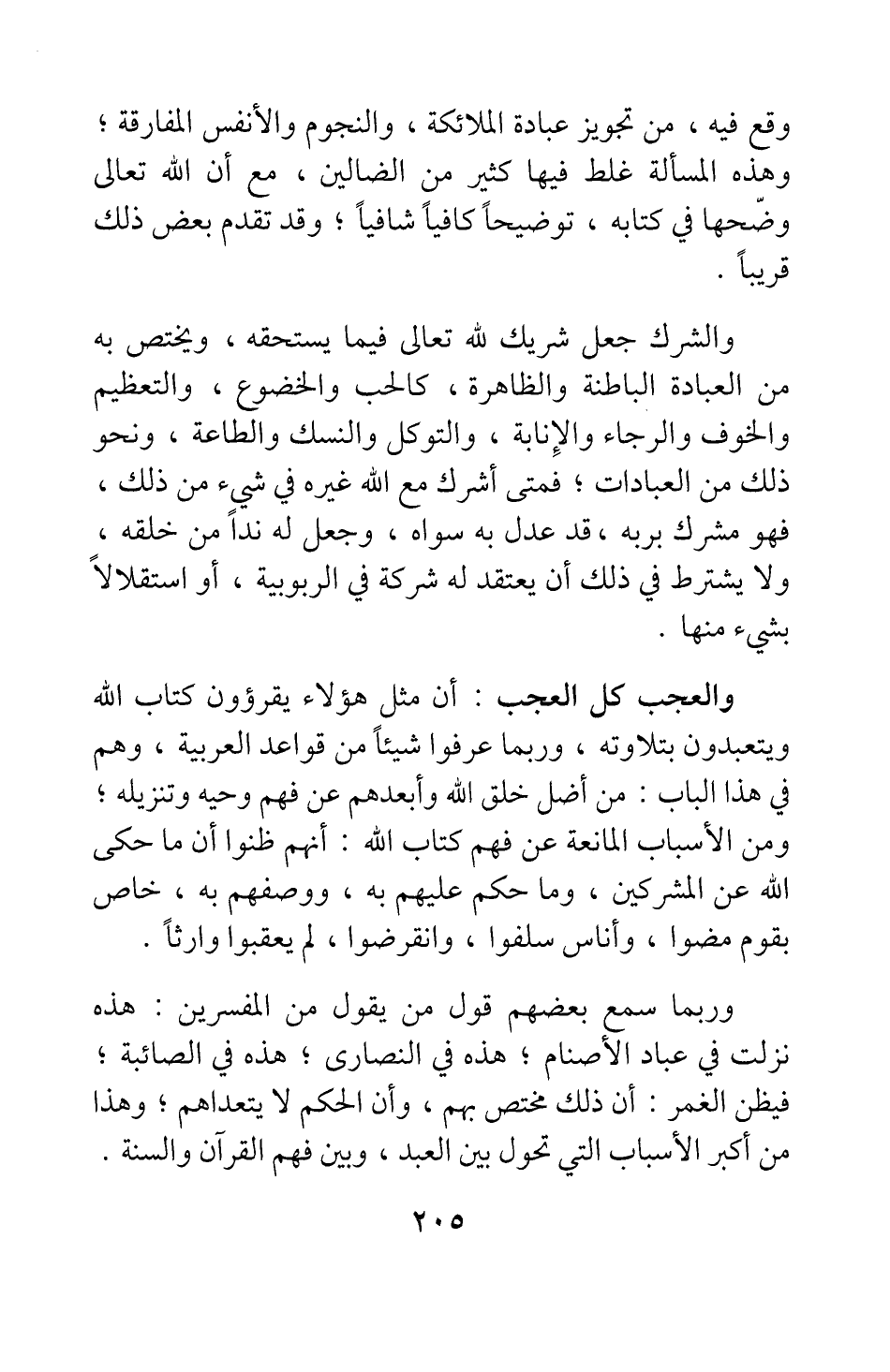 والعجب كل العجب أن مثل هؤلاء يقرؤون كتاب الله ويتعبدون بتلاوته، وربما عرفوا شيئا من قواعد العربية، وهم في هذا الباب: من أضل خلق الله وأبعدهم عن فهم وحيه وتنْزيله; ومن الأسباب المانعة عن فهم كتاب الله: أنهم ظنوا أن ما حكى الله عن المشركين، وما حكم عليهم به، ووصفهم به، خاص بقوم مضوا، وأناس سلفوا وانقرضوا، لم يعقبوا وارثا.