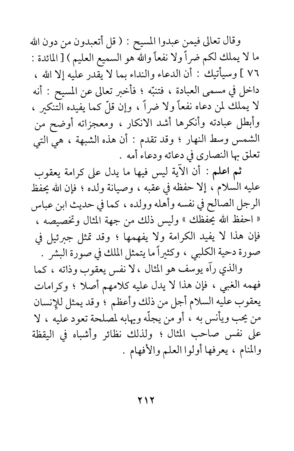 ثم اعلم: أن الآية ليس فيها ما يدل على كرامة يعقوب عليه السلام، إلا حفظه في عقبه، وصيانة ولده; فإن الله يحفظ الرجل الصالح في نفسه وأهله وولده، كما في حديث ابن عباس: " احفظ الله يحفظك " 1، وليس ذلك من جهه المثال وتخصيصه، فإن هذا لا يفيد الكرامة ولا يفهمها; وقد تمثل جبرائيل في صورة دحية الكلبي، وكثيرا ما يتمثل الملك في صورة البشر.