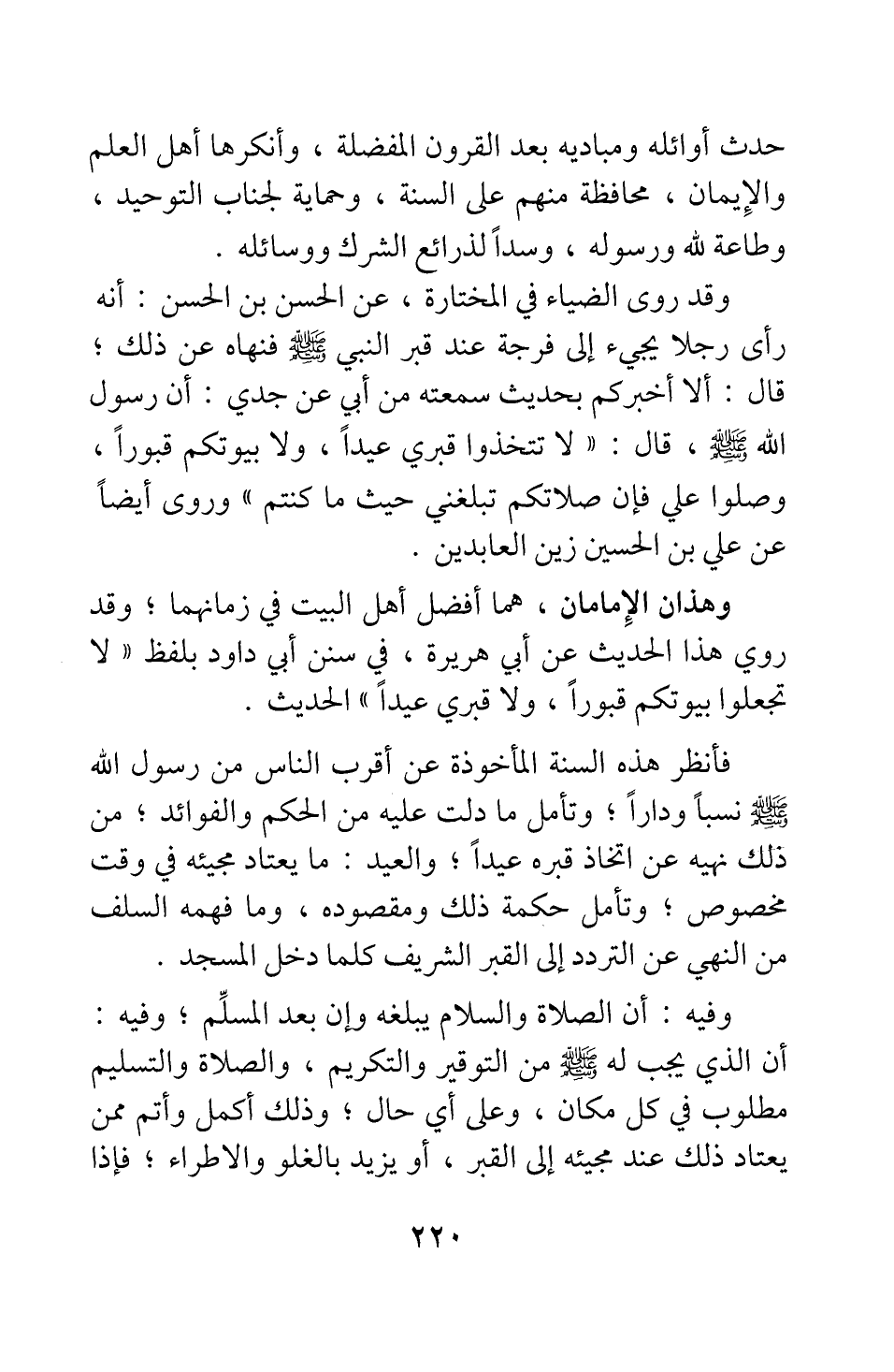 وقد روى الضياء في المختارة، عن الحسن بن الحسن أنه رأى رجلا يجيء إلى فرجة عند قبر النبي صلى الله عليه وسلم فنهاه عن ذلك; قال: ألا أخبركم بحديث سمعته من أبي عن جدي: أن رسول الله صلى الله عليه وسلم قال: " لا تتخذوا قبري عيدا، ولا بيوتكم قبورا، وصلوا علي فإن صلاتكم تبلغني حيث ما كنتم "1، وروى أيضا عن علي بن الحسين زين العابدين.