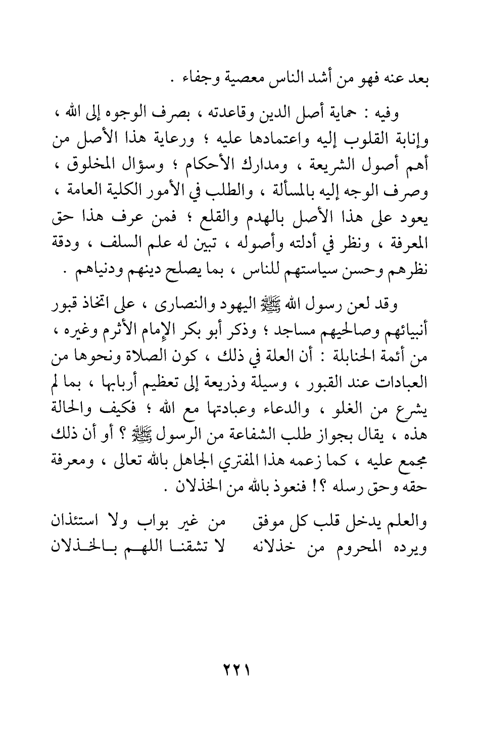 وقد لعن رسول الله صلى الله عليه وسلم اليهود والنصارى، على اتخاذ قبور أنبيائهم وصالحيهم مساجد; وذكر أبو بكر الإمام الأثرم وغيره، من أئمة الحنابلة أن العلة في ذلك، كون الصلاة ونحوها من العبادات عند القبور، وسيلة وذريعة إلى تعظيم أربابها، بما لم يشرع من الغلو، والدعاء وعبادتها مع الله; فكيف والحالة هذه، يقال بجواز طلب الشفاعة من الرسول صلى الله عليه وسلم؟ أو أن ذلك مجمع عليه، كما زعمه هذا المفتري الجاهل بالله تعالى، ومعرفة حقه وحق رسله؟! فنعوذ بالله من الخذلان.