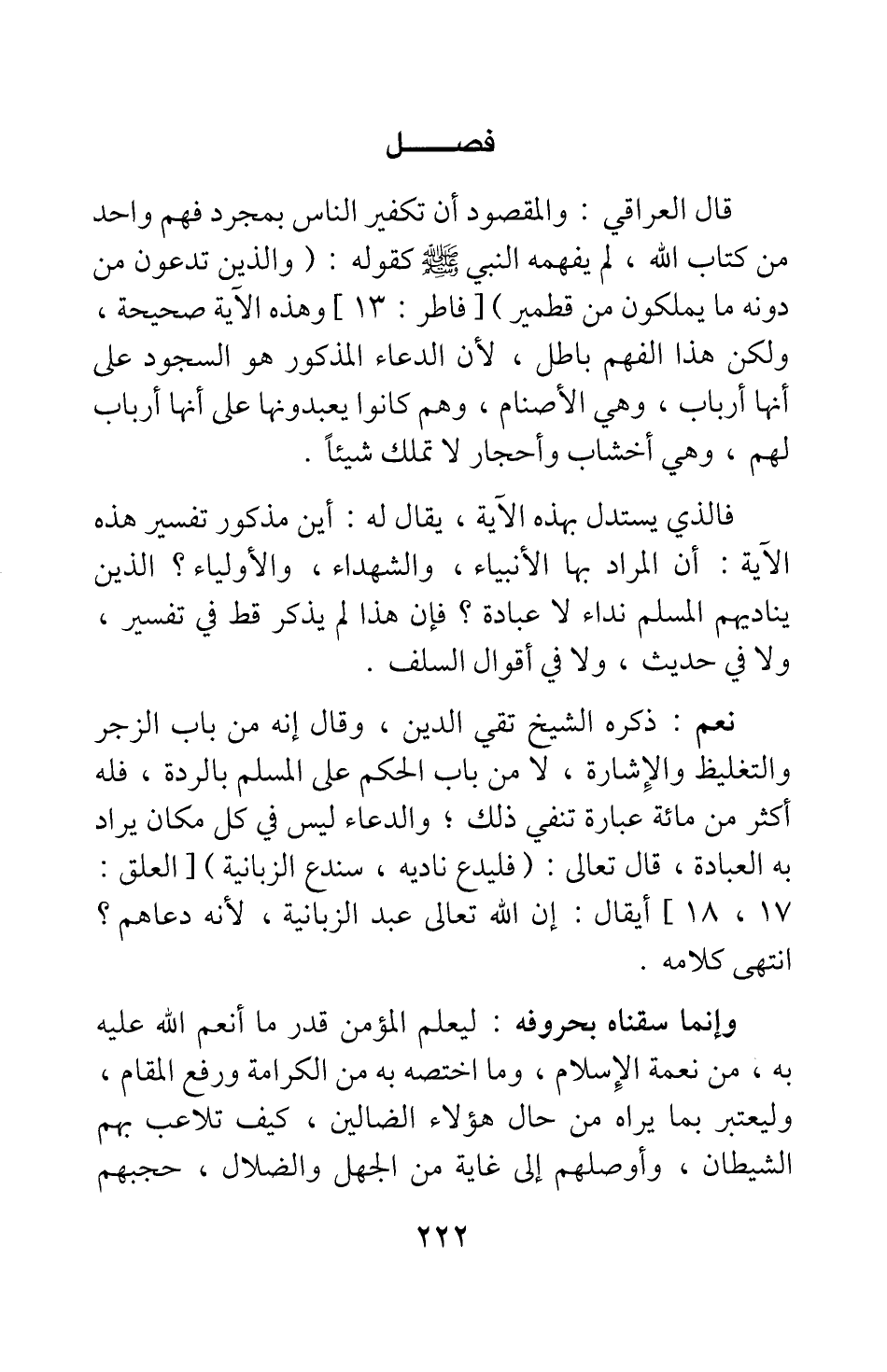 قال العراقي: والمقصود أن تكفير الناس بمجرد فهم واحد من كتاب الله، لم يفهمه النبي صلى الله عليه وسلم كقوله: {وَالَّذِينَ تَدْعُونَ مِنْ دُونِهِ مَا يَمْلِكُونَ مِنْ قِطْمِيرٍ} [سورة فاطر آية: 13] ، وهذه الآية صحيحة، ولكن هذا الفهم باطل، لأن الدعاء المذكور هو السجود على أنها أرباب، وهي الأصنام، وهم كانوا يعبدونها على أنها أرباب لهم، وهي أخشاب وأحجار لا تملك شيئا.