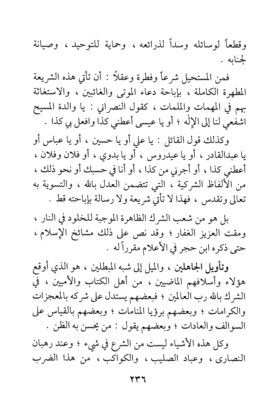 وكذلك قول القائل: يا علي أو يا حسين، أو يا عباس، أو يا عبد القادر، أو يا عيدروس، أو يا بدوي، أو فلان وفلان، أعطني كذا، أو أجرني من كذا، أو أنا في حسبك أو نحو ذلك، من الألفاظ الشركية التي تتضمن العدل بالله، والتسوية به تعالى وتقدس؛ فهذا لا تأتي شريعة ولا رسالة بإباحته قط، بل هو من شعب الشرك الظاهرة الموجبة للخلود في النار، ومقت العزيز الغفار، وقد نص على ذلك مشائخ الإسلام، حتى ذكره ابن حجر في الأعلام مقررا له: