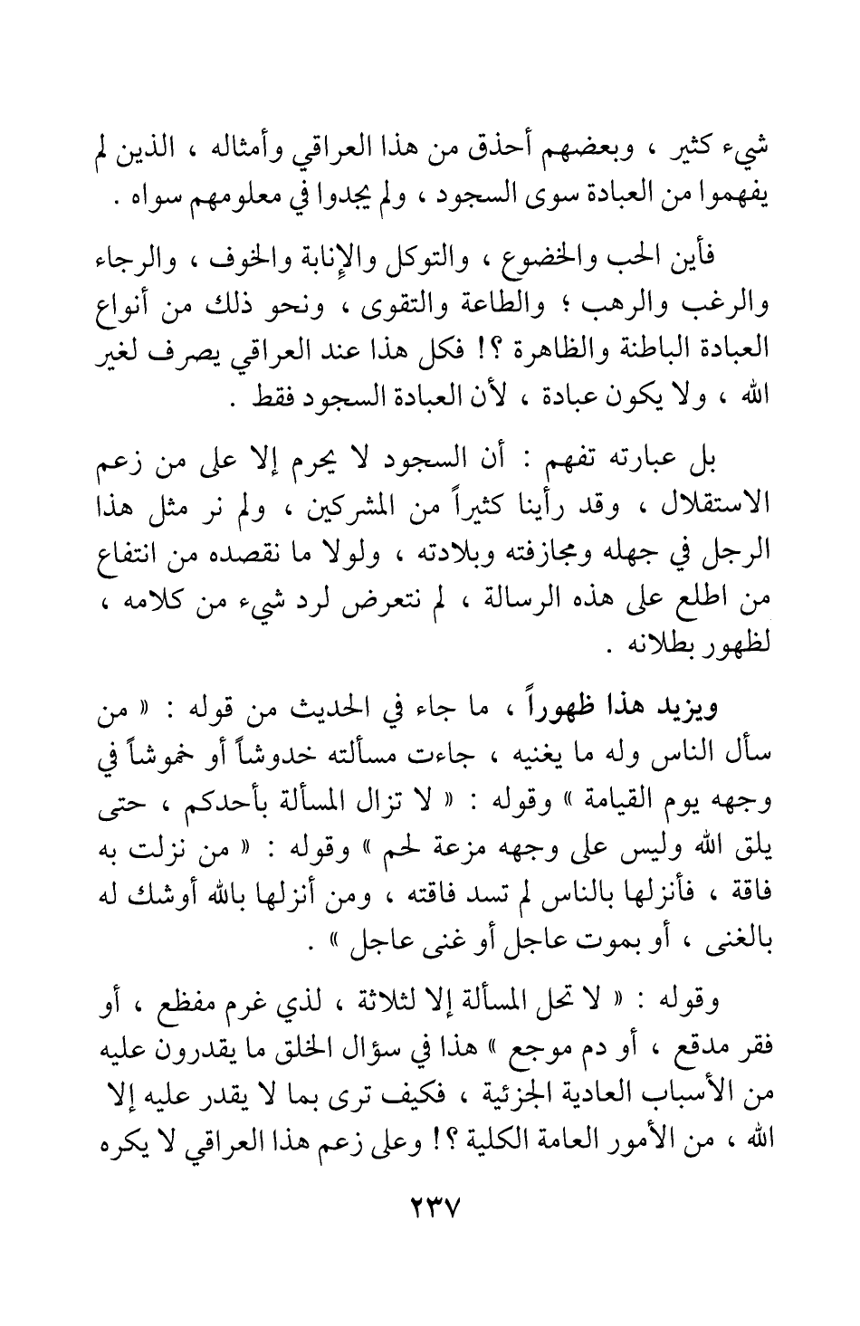 فأين الحب والخضوع، والتوكل والإنابة والخوف، والرجاء والرغب والرهب، والطاعة والتقوى، ونحو ذلك من أنواع العبادة الباطنة والظاهرة؟! فكل هذا عند العراقي يصرف لغير الله، ولا يكون عبادة، لأن العبادة السجود فقط.