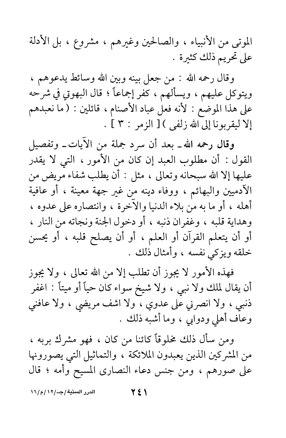وقال رحمه الله: من جعل بينه وبين الله وسائط يدعوهم، ويتوكل عليهم، ويسألهم، كفر إجماعا. قال البهوتي في شرحه على هذا الموضع: لأنه فعل عباد الأصنام، قائلين: {مَا نَعْبُدُهُمْ إِلَّا لِيُقَرِّبُونَا إِلَى اللَّهِ زُلْفَى} [سورة الزمر آية: 3] .
