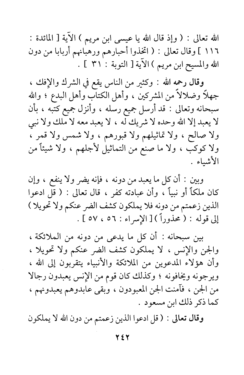 الله تعالى: {وَإِذْ قَالَ اللَّهُ يَا عِيسَى ابْنَ مَرْيَمَ} [سورة المائدة آية: 116] الآية، وقال تعالى: {اتَّخَذُوا أَحْبَارَهُمْ وَرُهْبَانَهُمْ أَرْبَاباً مِنْ دُونِ اللَّهِ وَالْمَسِيحَ ابْنَ مَرْيَمَ} [سورة التوبة آية: 31] . الآية وقال رحمه الله: وكثير من الناس يقع في الشرك والإفك، جهلا وضلالا من المشركين وأهل الكتاب وأهل البدع; والله سبحانه وتعالى قد أرسل جميع رسله، وأنزل جميع كتبه، بأن لا يعبد إلا الله وحده لا شريك له، لا يعبد معه لا ملك ولا نبي ولا صالح، ولا تماثيلهم ولا قبورهم، ولا شمس ولا قمر، ولا كوكب، ولا ما صنع من التماثيل لأجلهم، ولا شيئا من الأشياء.