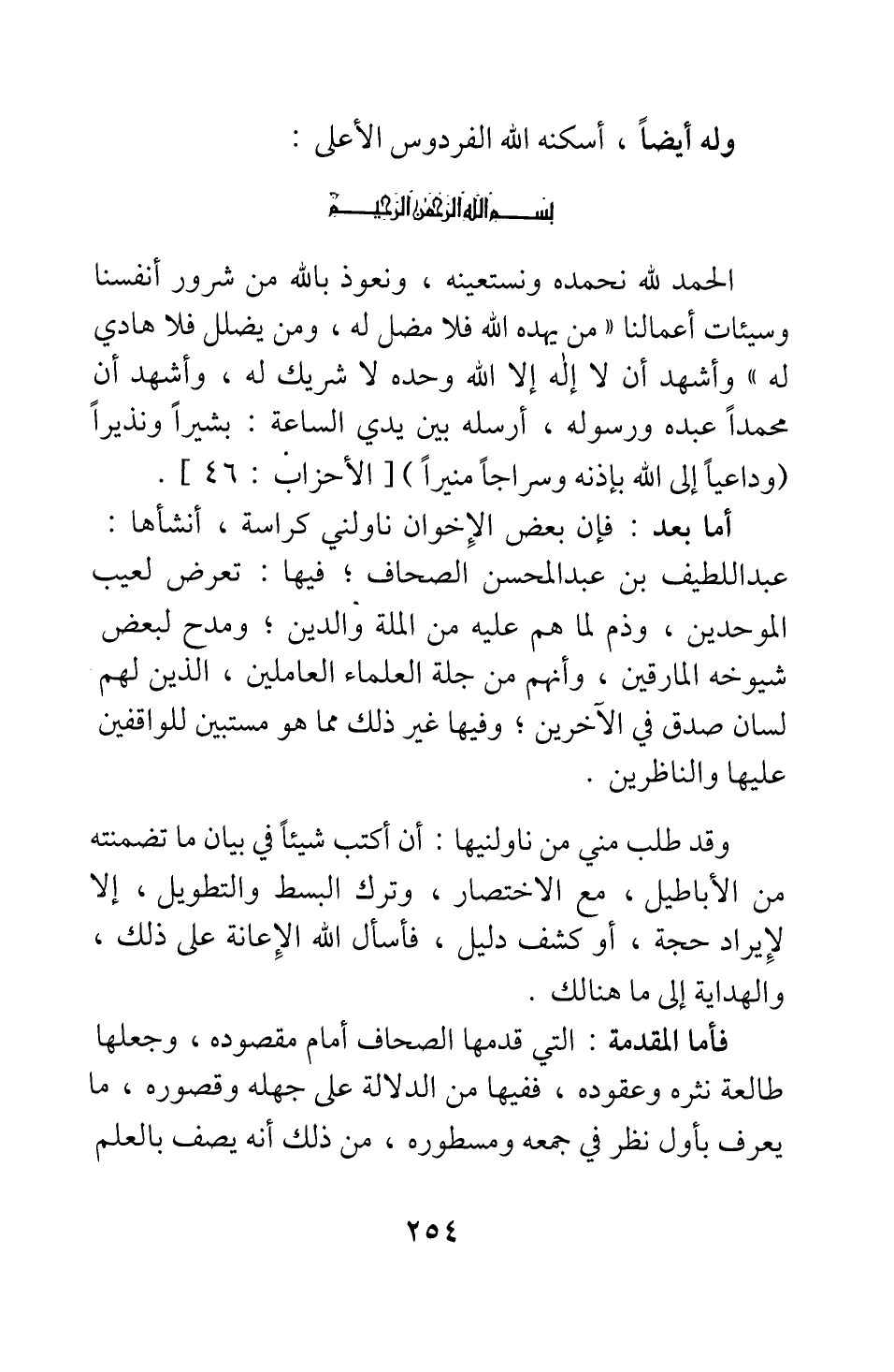 أما بعد: فإن بعض الإخوان ناولني كراسة أنشأها عبد اللطيف بن عبد المحسن الصحاف، فيها تعرض لعيب الموحدين، وذم لما هم عليه من الملة والدين، ومدح لبعض شيوخه المارقين، وأنهم من جلة العلماء العاملين، الذين لهم لسان صدق في الآخرين; وفيها غير ذلك مما هو مستبين للواقفين عليها والناظرين.
