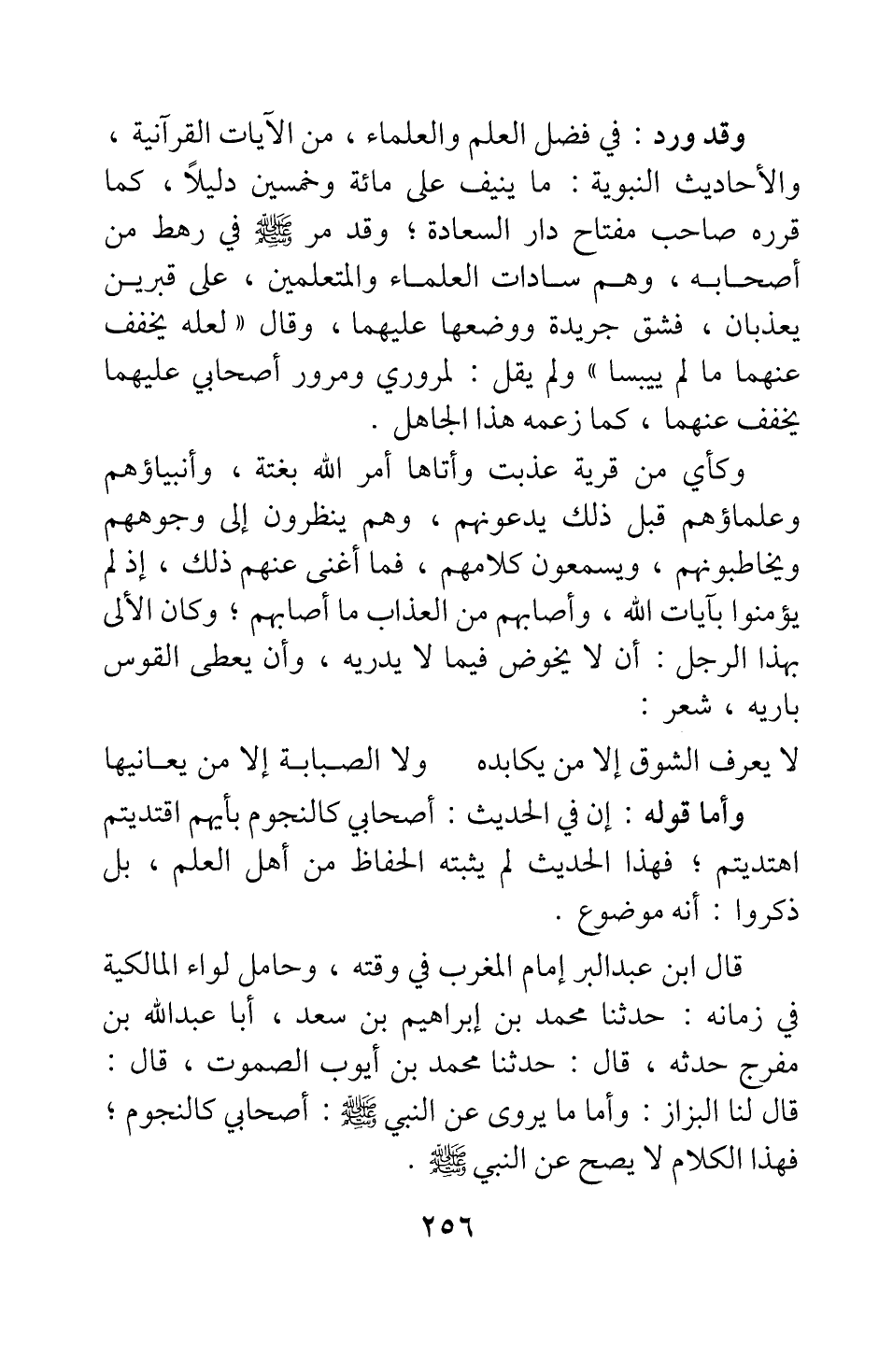 وقد ورد في فضل العلم والعلماء، من الآيات القرآنية، والأحاديث النبوية ما ينيف على مائة وخمسين دليلا، كما قرره صاحب مفتاح دار السعادة، وقد مر صلى الله عليه وسلم في رهط من أصحابه، وهم سادات العلماء والمتعلمين، على قبرين يعذبان، فشق جريدة ووضعها عليهما، وقال: " لعله يخفف عنهما ما لم ييبسا " 1، ولم يقل: لمروري ومرور أصحابي عليهما يخفف عنهما، كما زعمه هذا الجاهل.