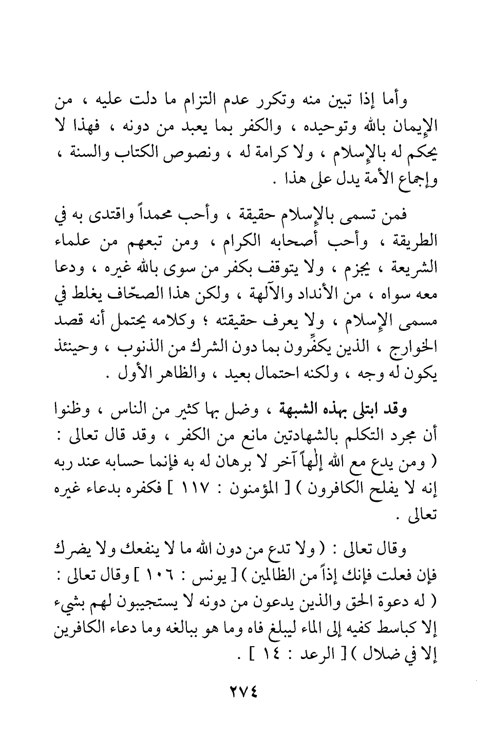 فمن تسمى بالإسلام حقيقة، وأحب محمدا واقتدى به في الطريقة، وأحب أصحابه الكرام، ومن تبعهم من علماء الشريعة، يجزم ولا يتوقف بكفر من سوّى بالله غيره، ودعا معه سواه من الأنداد والآلهة؛ ولكن هذا الصحاف يغلط في مسمى الإسلام، ولا يعرف حقيقته; وكلامه يحتمل أنه قصد الخوارج الذين يكفّرون بما دون الشرك من الذنوب، وحينئذ يكون له وجه، ولكنه احتمال بعيد، والظاهر الأول.