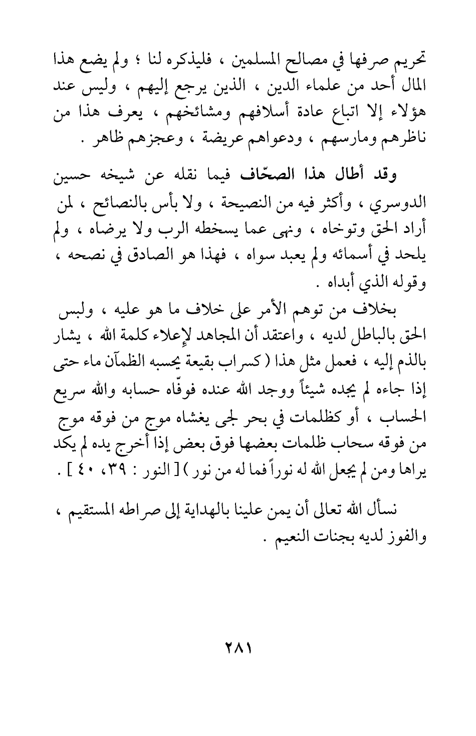 وقد أطال هذا الصحاف فيما نقله عن شيخه حسين الدوسري، وأكثر فيه من النصيحة، ولا بأس بالنصائح، لمن أراد الحق وتوخاه، ونهى عما يسخطه الرب ولا يرضاه، ولم يلحد في أسمائه ولم يعبد سواه؛ فهذا هو الصادق في نصحه، وقوله الذي أبداه.
