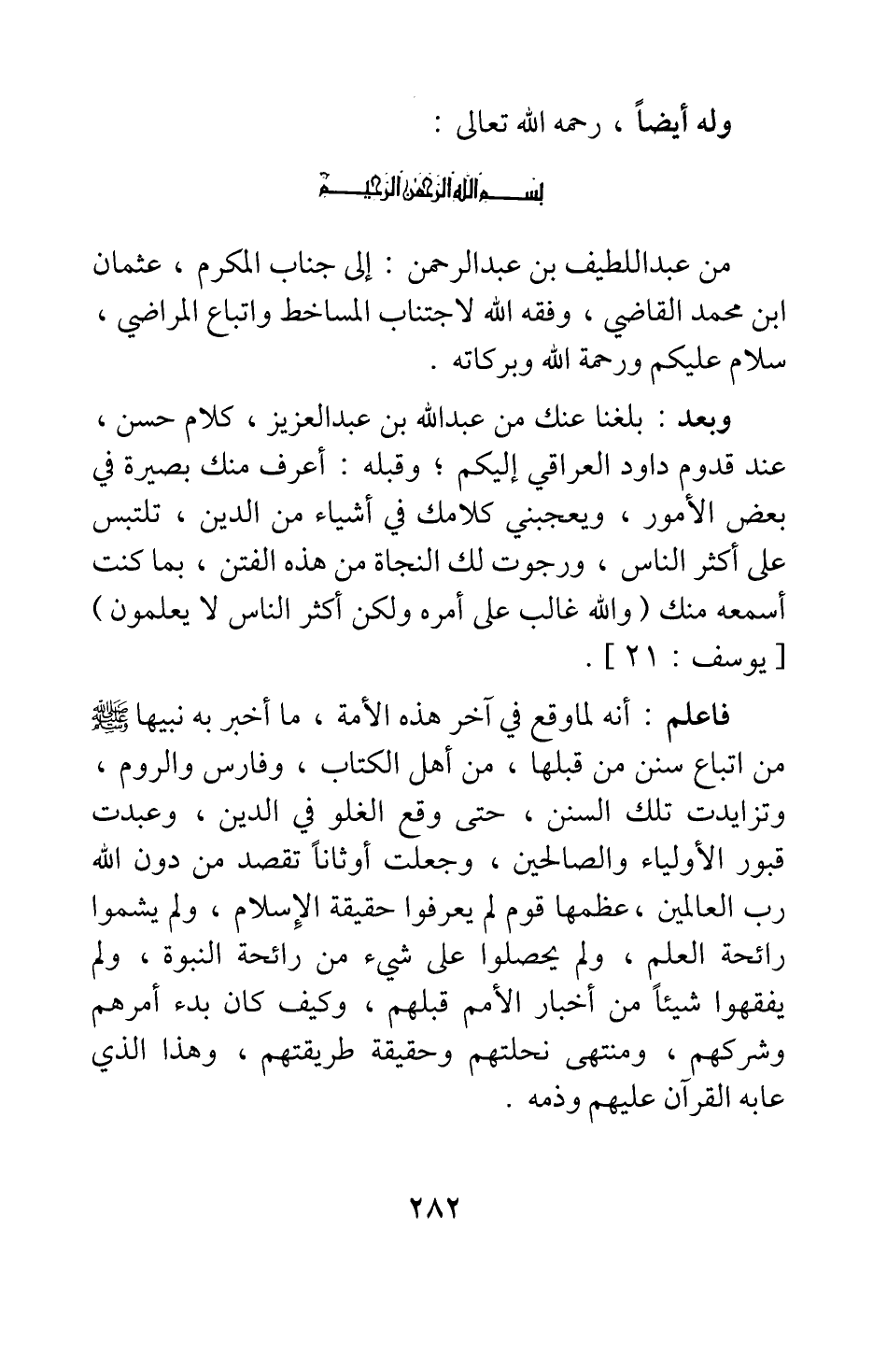من عبد اللطيف بن عبد الرحمن إلى جناب المكرم، عثمان بن محمد القاضي، وفقه الله لاجتناب المساخط واتباع المراضي، سلام عليكم ورحمة الله وبركاته.