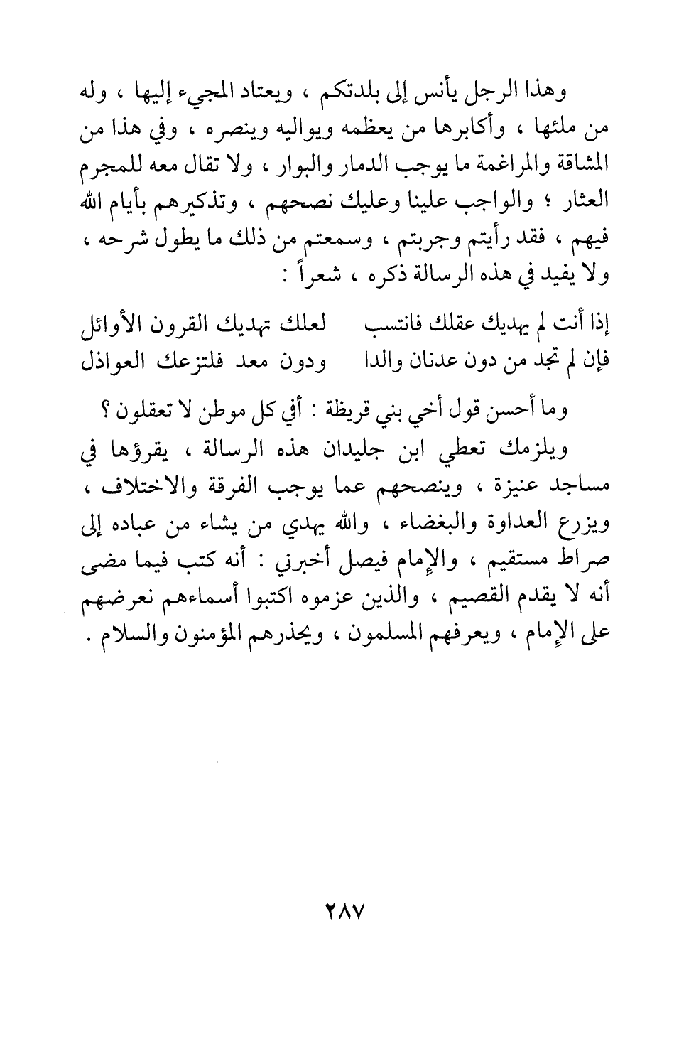 وهذا الرجل يأنس إلى بلدتكم، ويعتاد المجيء إليها، وله من ملئها وأكابرها من يعظمه ويواليه وينصره؛ وفي هذا من المشاقة والمراغمة ما يوجب الدمار والبوار، ولا تقال معه للمجرم العثار; والواجب علينا وعليك نصحهم، وتذكيرهم بأيام الله فيهم، فقد رأيتم وجربتم، وسمعتم من ذلك ما يطول شرحه، ولا يفيد في هذه الرسالة ذكره، شعرا: