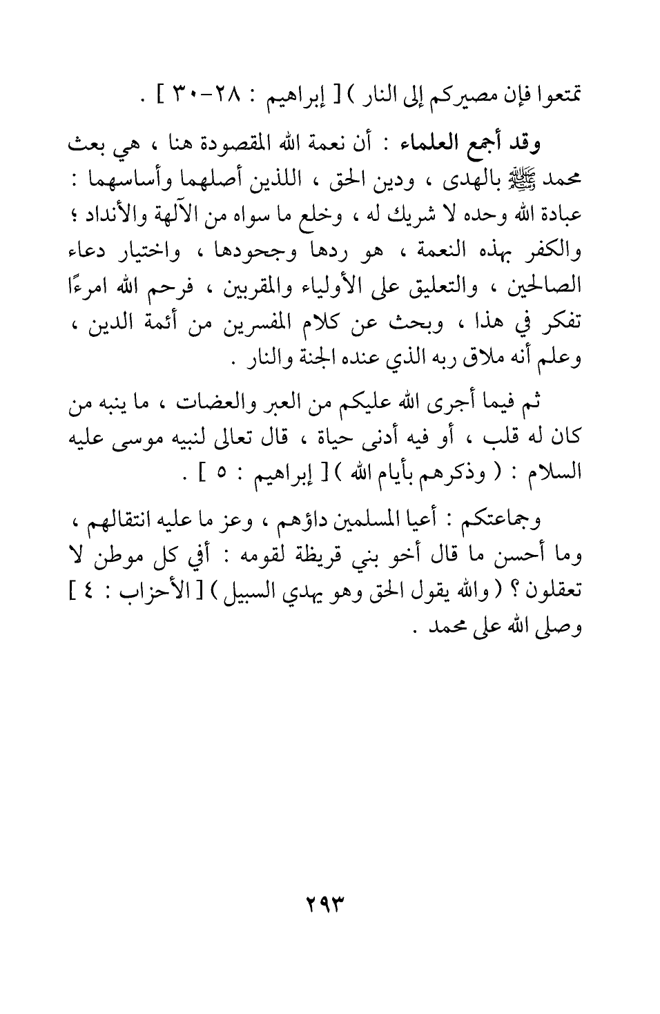 وقد أجمع العلماء أن نعمة الله المقصودة هنا، هي بعث محمد صلى الله عليه وسلم بالهدى، ودين الحق، اللذين أصلهما وأساسهما: عبادة الله وحده لا شريك له، وخلع ما سواه من الآلهة والأنداد; والكفر بهذه النعمة، هو ردها وجحودها، واختيار دعاء الصالحين، والتعليق على الأولياء والمقربين. فرحم الله امرءا تفكر في هذا، وبحث عن كلام المفسرين من أئمة الدين، وعلم أنه ملاق ربه الذي عنده الجنة والنار.