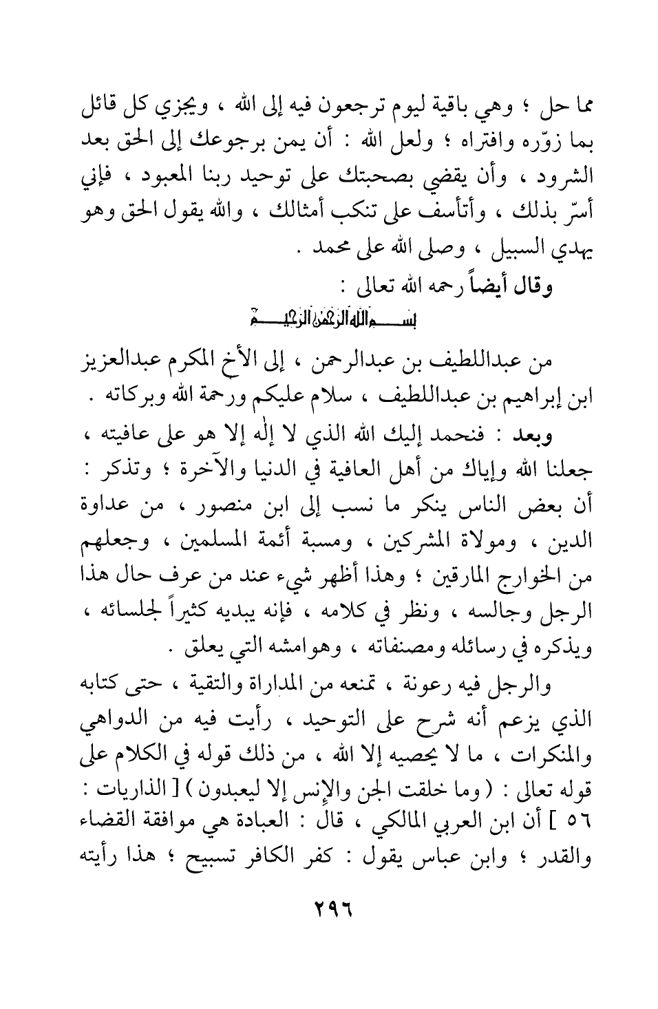 [رسالة من عبد اللطيف بن عبد الرحمن إلى عبد العزيز بن إبراهيم]