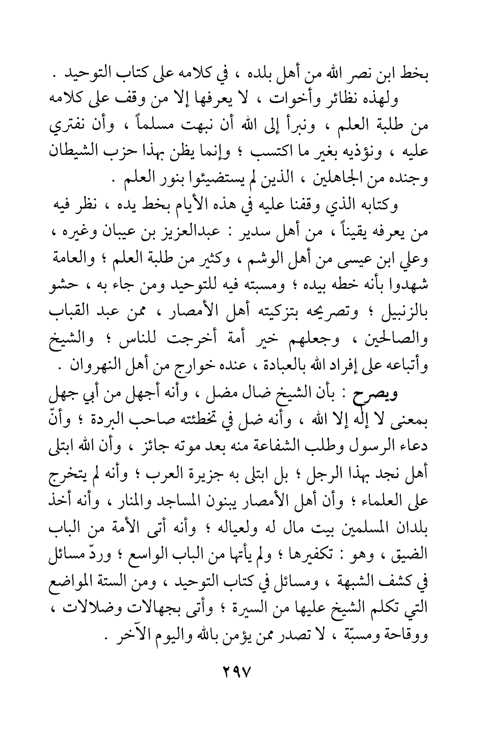 وكتابه الذي وقفنا عليه في هذه الأيام بخط يده، نظر فيه من يعرفه يقينا، من أهل سدير: عبد العزيز بن عيبان وغيره، وعلي بن عيسى من أهل الوشم، وكثير من طلبة العلم; والعامة شهدوا بأنه خطه بيده; ومسبته فيه للتوحيد ومن جاء به، حشو بالزنبيل، وتصريحه بتزكيته أهل الأمصار، ممن عبد القباب والصالحين، وجعلهم خير أمة أخرجت للناس; والشيخ واتباعه على إفراد الله بالعبادة، عنده خوارج من أهل النهروان.