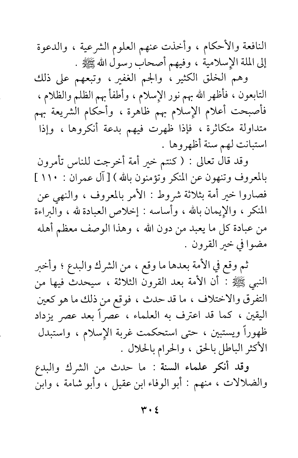 النافعة والأحكام، وأخذت عنهم العلوم الشرعية، والدعوة إلى الملة الإسلامية، وفيهم أصحاب رسول الله وهم الخلق الكثير، والجم الغفير. وتبعهم على ذلك التابعون، فأظهر الله بهم نور الإسلام، وأطفأ بهم الظلم والظلام؛ فأصبحت أعلام الإسلام بهم ظاهرة، وأحكام الشريعة بهم متداولة متكاثرة، فإذا ظهرت فيهم بدعة أنكروها، وإذا استبانت لهم سنة أظهروها.