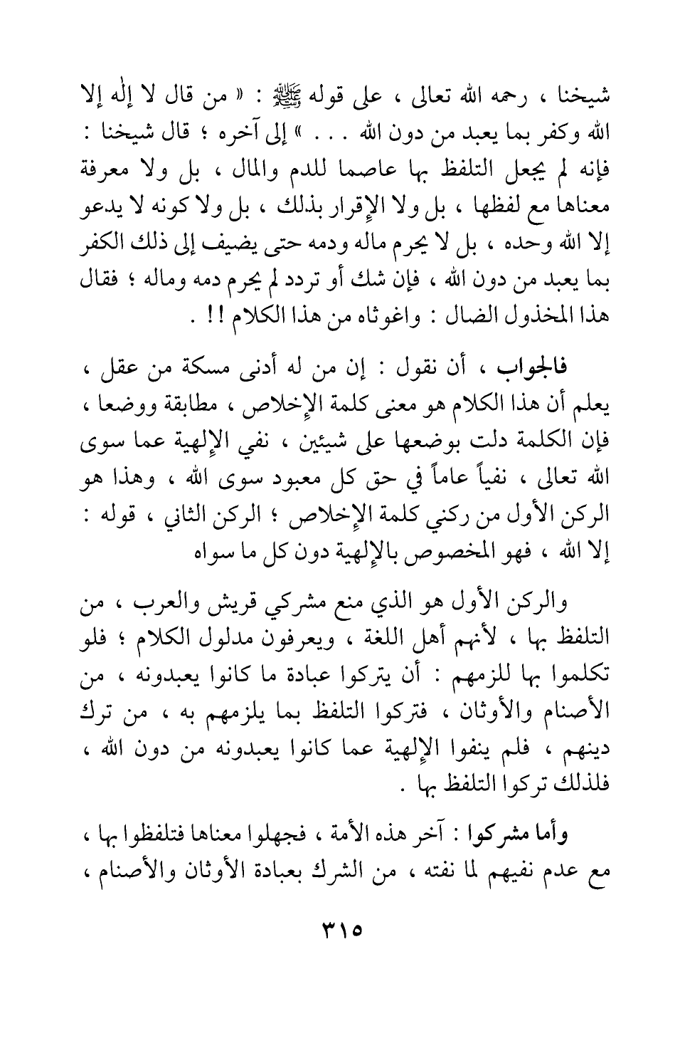 شيخنا، رحمه الله تعالى، على قوله صلى الله عليه وسلم: " من قال: لا إله إلا الله، وكفر بما يعبد من دون الله " 1 إلى آخره، قال شيخنا: فإنه لم يجعل التلفظ بها عاصما للدم والمال، بل ولا معرفة معناها مع لفظها، بل ولا الإقرار بذلك، بل ولا كونه لا يدعو إلا الله وحده، بل لا يحرم ماله ودمه، حتى يضيف إلى ذلك الكفر بما يعبد من دون الله، فإن شك أو تردد لم يحرم دمه وماله ; فقال هذا المخذول الضال: واغوثاه من هذا الكلام!!.