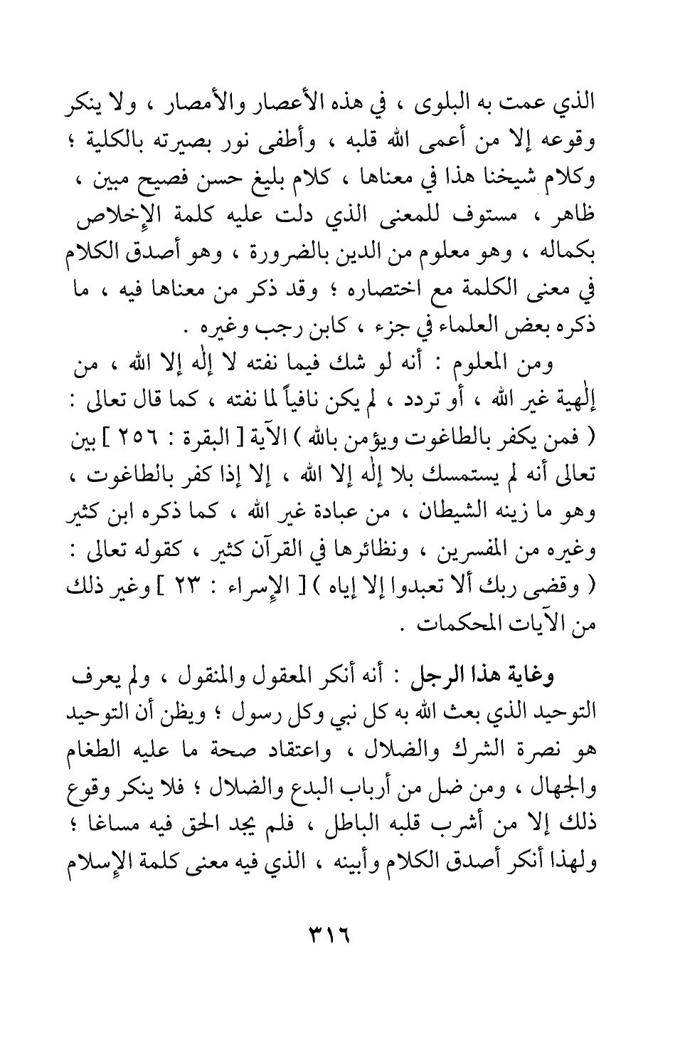 الذي عمت به البلوى في هذه الأعصار والأمصار؛ ولا ينكر وقوعه إلا من أعمى الله قلبه، وأطفى نور بصيرته بالكلية. وكلام شيخنا هذا في معناها كلام بليغ حسن فصيح مبين، ظاهر، مستوف للمعنى الذي دلت عليه كلمة الإخلاص بكماله؛ وهو معلوم من الدين بالضرووة، وهو أصدق الكلام في معنى الكلمة مع اختصاره، وقد ذكر من معناها فيه، ما ذكره بعض العلماء في جزء، كابن رجب وغيره.