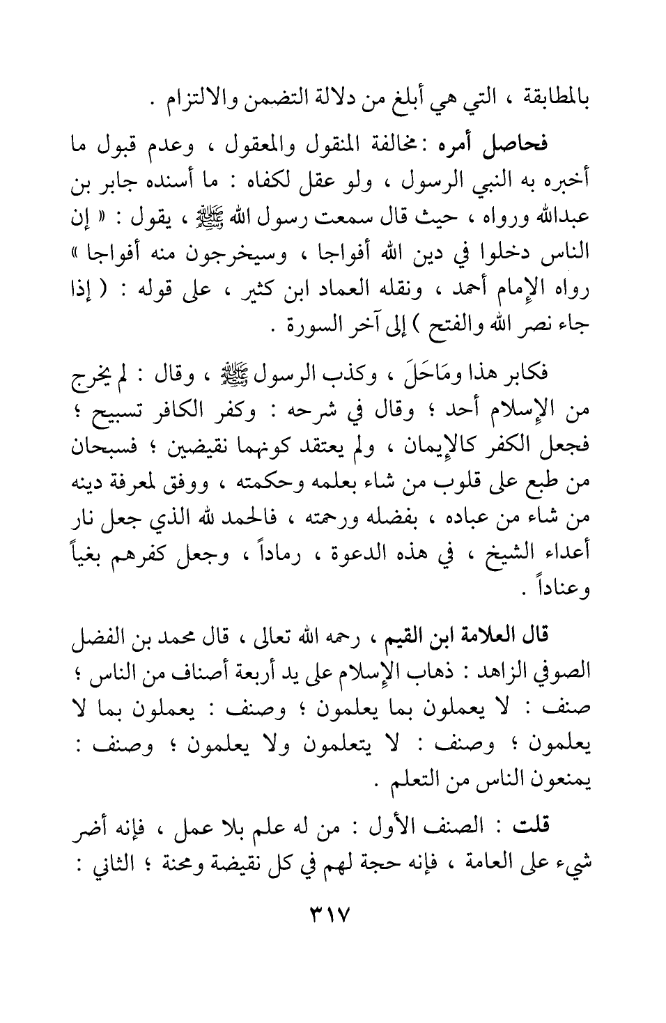 فحاصل أمره: مخالفة المنقول والمعقول، وعدم قبول ما أخبره به النبي الرسول، ولو عقل لكفاه ما أسنده جابر بن عبد الله ورواه، حيث قال سمعت رسول الله صلى الله عليه وسلم يقول: "إن الناس دخلوا في دين الله أفواجا، وسيخرجون منه أفواجا " 1 رواه الإمام أحمد، ونقله العماد ابن كثير، على قوله: {إِذَا جَاءَ نَصْرُ اللَّهِ وَالْفَتْحُ} [سورة النصر آية: 1] إلى آخر السورة.
