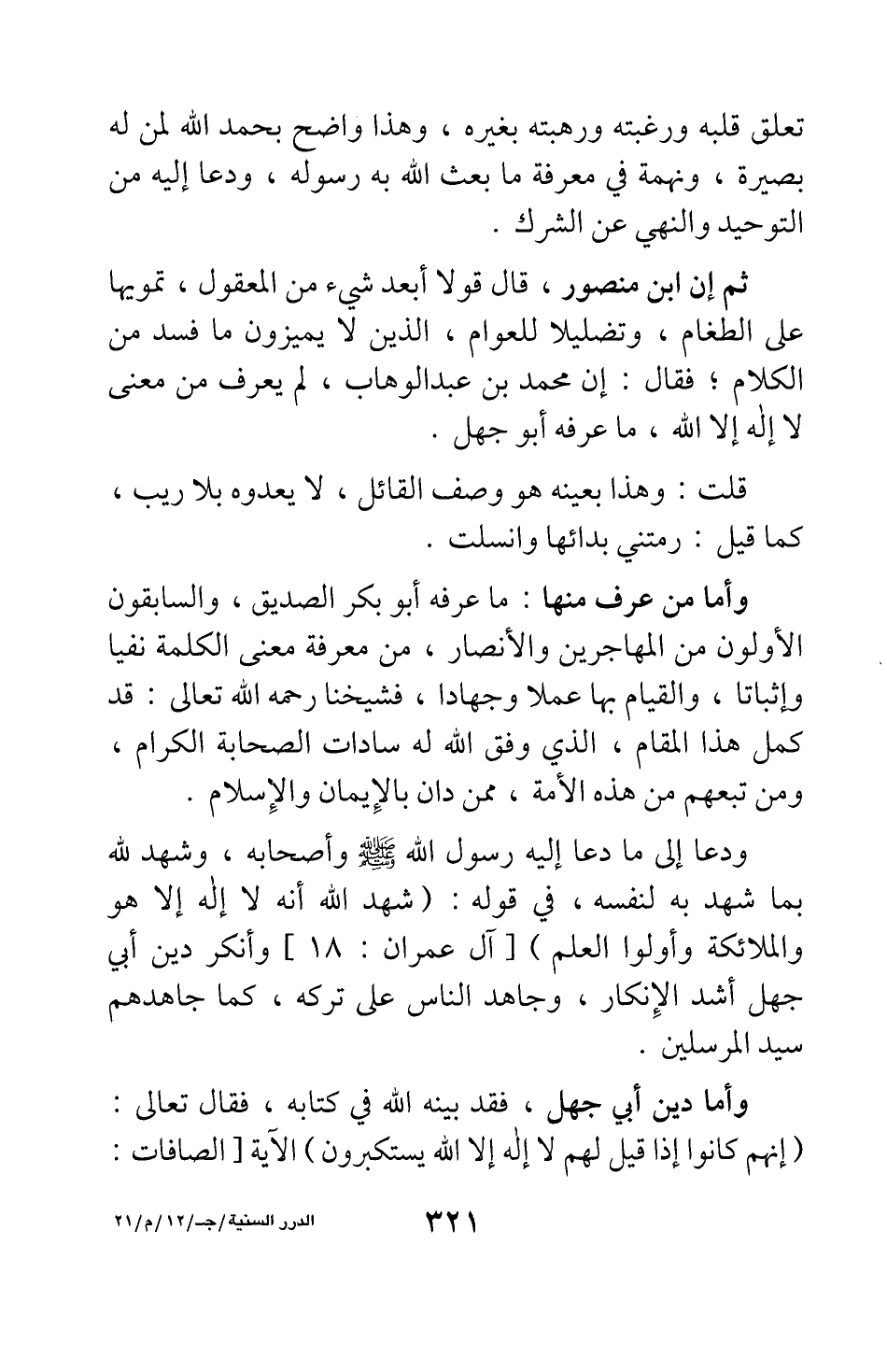 وأما من عرف منها ما عرفه أبو بكر الصديق، والسابقون الأولون من المهاجرين والأنصار، من معرفة معنى الكلمة نفيا وإثباتا، والقيام بها عملا وجهادا، فشيخنا رحمه الله تعالى قد كمل هذا المقام، الذي وفق الله له سادات الصحابة الكرام، ومن تبعهم من هذه الأمة، ممن دان بالإيمان والإسلام، ودعا إلى ما دعا إليه رسول الله صلى الله عليه وسلم وأصحابه، وشهد لله بما شهد به لنفسه، في قوله: {شَهِدَ اللَّهُ أَنَّهُ لا إِلَهَ إِلَّا هُوَ وَالْمَلائِكَةُ وَأُولُو الْعِلْمِ} [سورة آل عمران آية: 18] ، وأنكر دين أبي جهل أشد الإنكار، وجاهد الناس على تركه، كما جاهدهم سيد المرسلين.