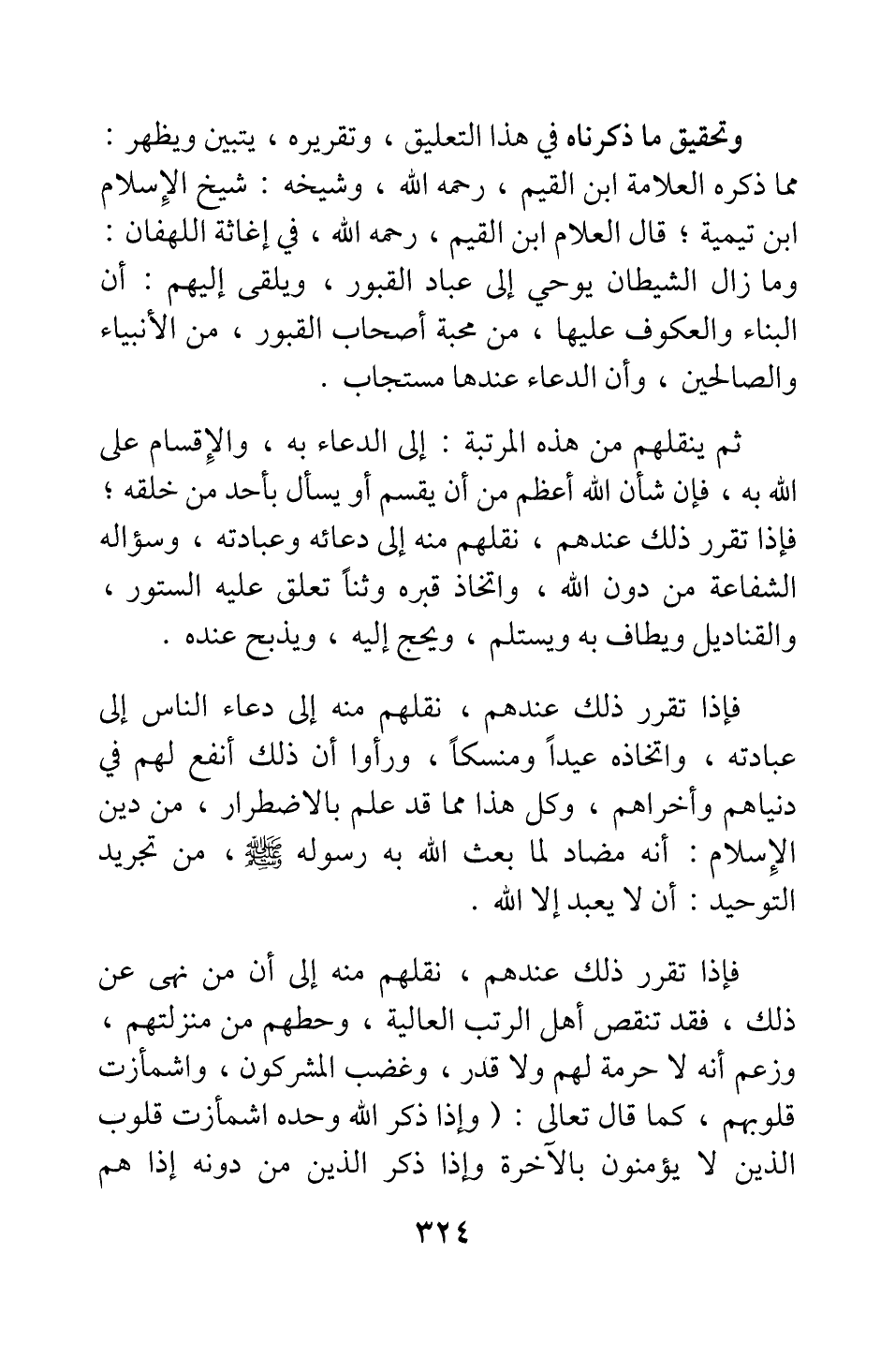 وتحقيق ما ذكرناه في هذا التعليق، وتقريره، يتبين ويظهر مما ذكره العلامة ابن القيم، رحمه الله، وشيخه شيخ الإسلام ابن تيمية: قال العلامة ابن القيم، رحمه الله، في "إغاثة اللهفان": وما زال الشيطان يوحي إلى عباد القبور، ويلقي إليهم أن البناء والعكوف عليها، من محبة أصحاب القبور، من الأنبياء والصالحين، وأن الدعاء عندها مستجاب.