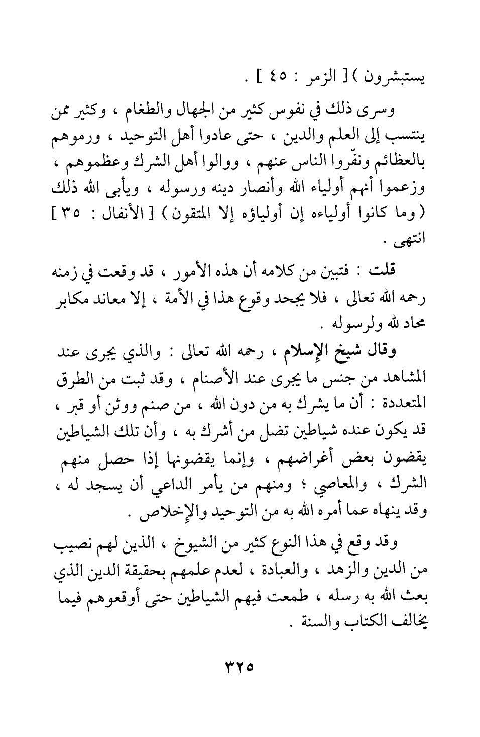 وسرى ذلك في نفوس كثير من الجهال والطغام، وكثير ممن ينتسب إلى العلم والدين، حتى عادَوْا أهل التوحيد، ورموهم بالعظائم ونفروا الناس عنهم، ووالوا أهل الشرك وعظموهم، وزعموا أنهم أولياء الله وأنصار دينه ورسوله، ويأبى الله ذلك؛ {وَمَا كَانُوا أَوْلِيَاءَهُ إِنْ أَوْلِيَاؤُهُ إِلَّا الْمُتَّقُونَ} [سورة الأنفال آية: 34] . انتهى.