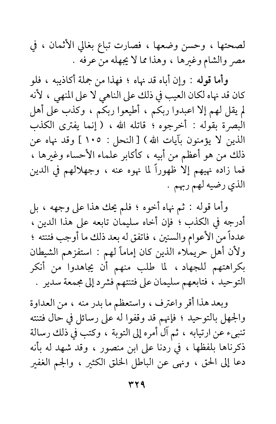 وأما قوله: ثم نهاه أخوه; فلم يحك هذا على وجهه، بل أدرجه في الكذب ; فإن أخاه سليمان تابعه على هذا الدين عددا من الأعوام والسنين، فاتفق له بعد ذلك ما أوجب فتنته ; ولأن أهل حريملاء الذين كان إماما لهم استفزهم الشيطان بكراهتهم للجهاد، لما طلب منهم أن يجاهدوا من أنكر التوحيد، فتابعهم سليمان على فتنتهم فشرد إلى مجمعة سدير.