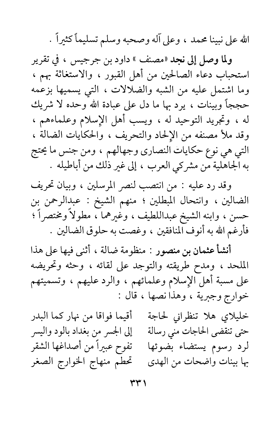 ولما وصل إلى نجد "مصنف" داود بن جرجيس، في تقرير استحباب دعاء الصالحين من أهل القبور، والاستغاثة بهم، وما اشتمل عليه من الشبه والضلالات، التي يسميها بزعمه حججا وبينات، يرد بها ما دل على عبادة الله وحده لا شريك له، وتجريد التوحيد له، ويسب أهل الإسلام وعلماءهم؛ وقد ملأ مصنفه من الإلحاد والتحريف، والحكايات الضالة، التي هي نوع حكايات النصارى وجهالهم، ومن جنس ما يحتج به الجاهلية من مشركي العرب، إلى غير ذلك من أباطيله.
