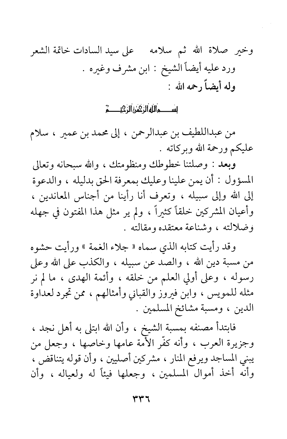 [رسالة من عبد اللطيف بن عبد الرحمن إلى محمد بن عمير في بيان ما تضمنه كتاب جلاء الغمة]