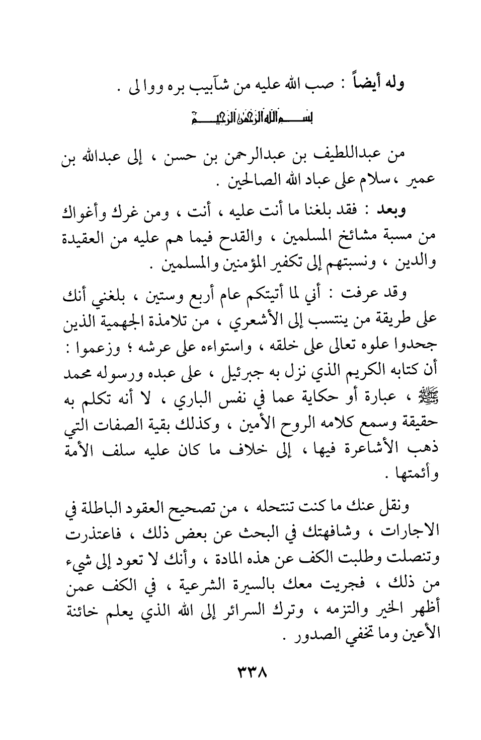 وبعد: فقد بلغنا ما أنت عليه، أنت ومن غرك وأغواك من مسبة مشايخ المسلمين، والقدح فيما هم عليه من العقيدة والدين، ونسبتهم إلى تكفير المؤمنين والمسلمين.