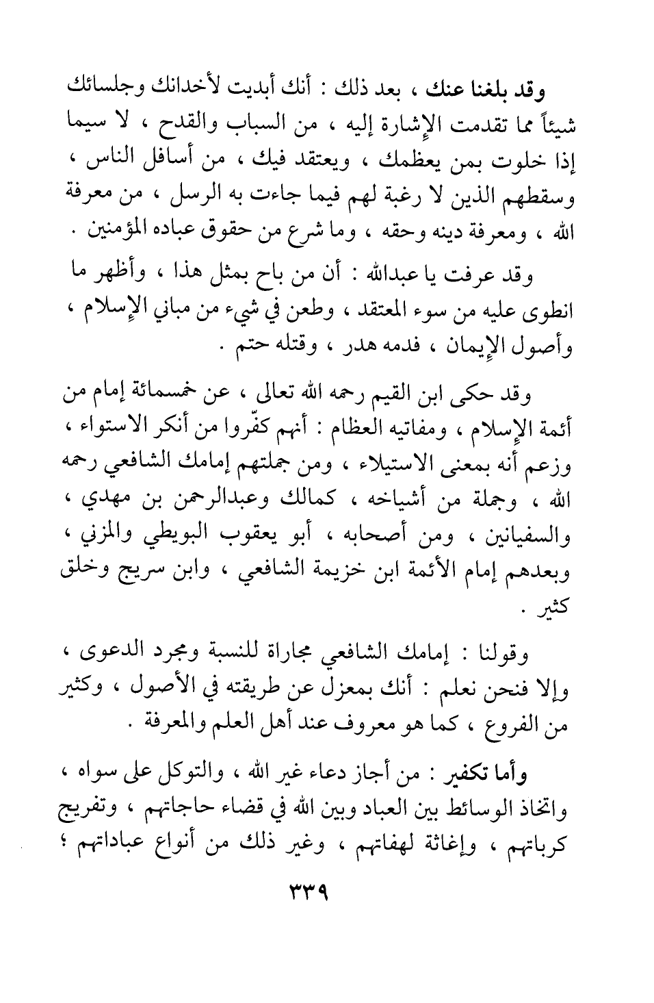 وقد بلغنا عنك، بعد ذلك أنك أبديت لأخدانك وجلسائك شيئا مما تقدمت الإشارة إليه، من السباب والقدح، لا سيما إذا خلوت بمن يعظمك، ويعتقد فيك، من أسافل الناس، وسقطهم الذين لا رغبة لهم فيما جاءت به الرسل، من معرفة الله، ومعرفة دينه وحقه، وما شرع من حقوق عباده المؤمنين.