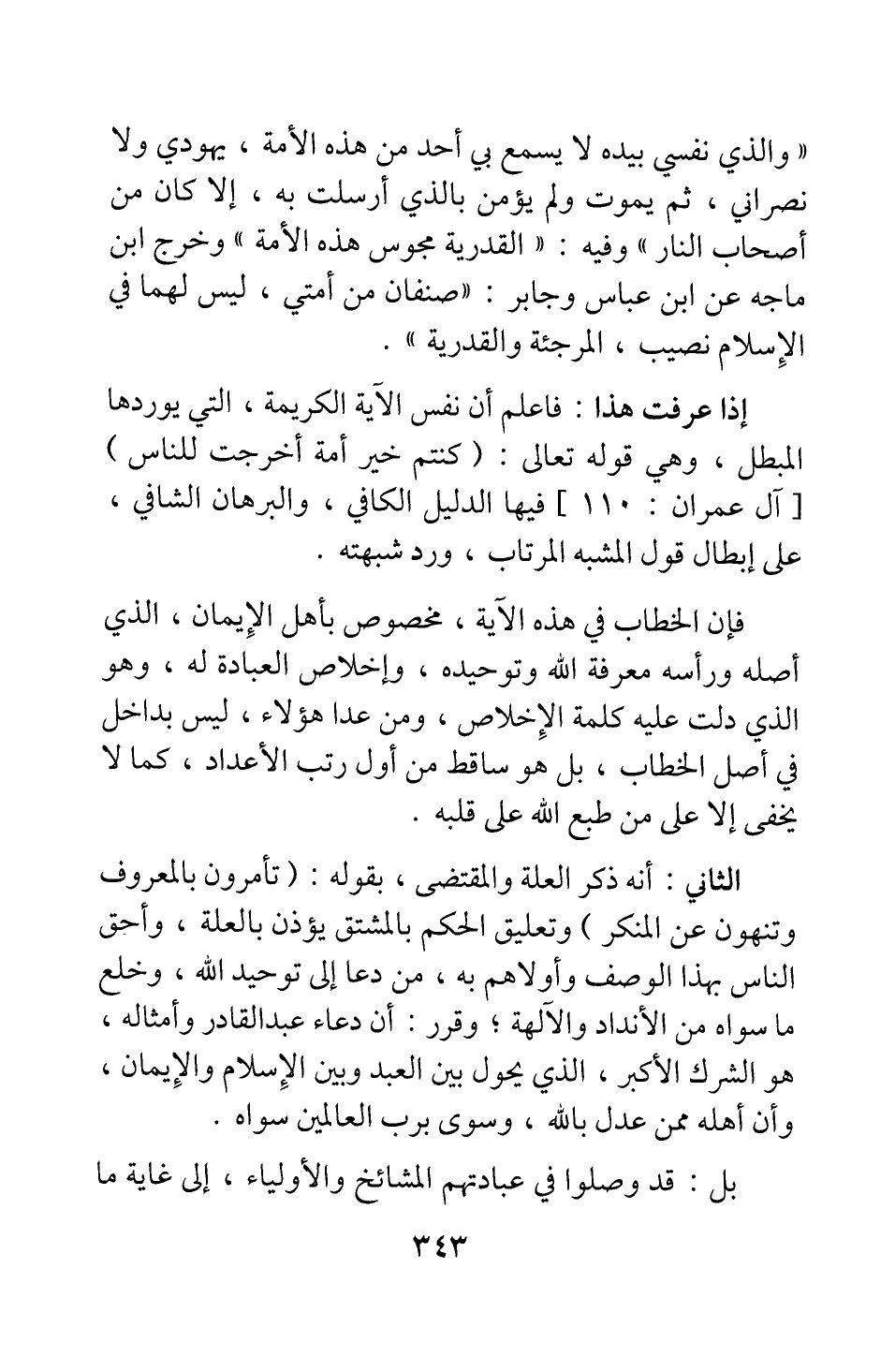 الثاني: أنه ذكر العلة والمقتضى، بقوله: {تَأْمُرُونَ بِالْمَعْرُوفِ وَتَنْهَوْنَ عَنِ الْمُنْكَرِ} [سورة آل عمران آية: 110] ؛ وتعليق الحكم بالمشتق يؤذن بالعلة، وأحق الناس بهذا الوصف وأولاهم به: من دعا إلى توحيد الله، وخلع ما سواه من الأنداد والآلهة ; وقرر أن دعاء عبد القادر وأمثاله، هو الشرك الأكبر، الذي يحول بين العبد وبين الإسلام والإيمان، وأن أهله ممن عدل بالله، وسوى برب العالمين سواه.