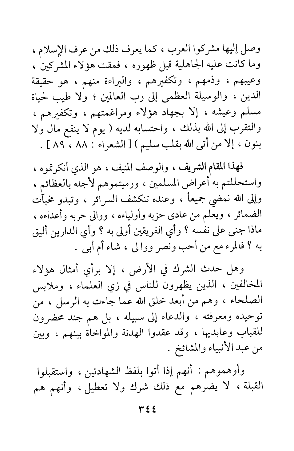 وصل إليها مشركو العرب، كما يعرف ذلك من عرف الإسلام، وما كانت عليه الجاهلية قبل ظهوره؛ فمقت هؤلاء المشركين، وعيبهم، وذمهم، وتكفيرهم، والبراءة منهم، هو حقيقة الدين، والوسيلة العظمى إلى رب العالمين ; ولا طيب لحياة مسلم وعيشه، إلا بجهاد هؤلاء ومراغمتهم، وتكفيرهم، والتقرب إلى الله بذلك، واحتسابه لديه، {يَوْمَ لا يَنْفَعُ مَالٌ وَلا بَنُون إِلَّا مَنْ أَتَى اللَّهَ بِقَلْبٍ سَلِيمٍ} [سورة الشعراء آية: 88-89] .