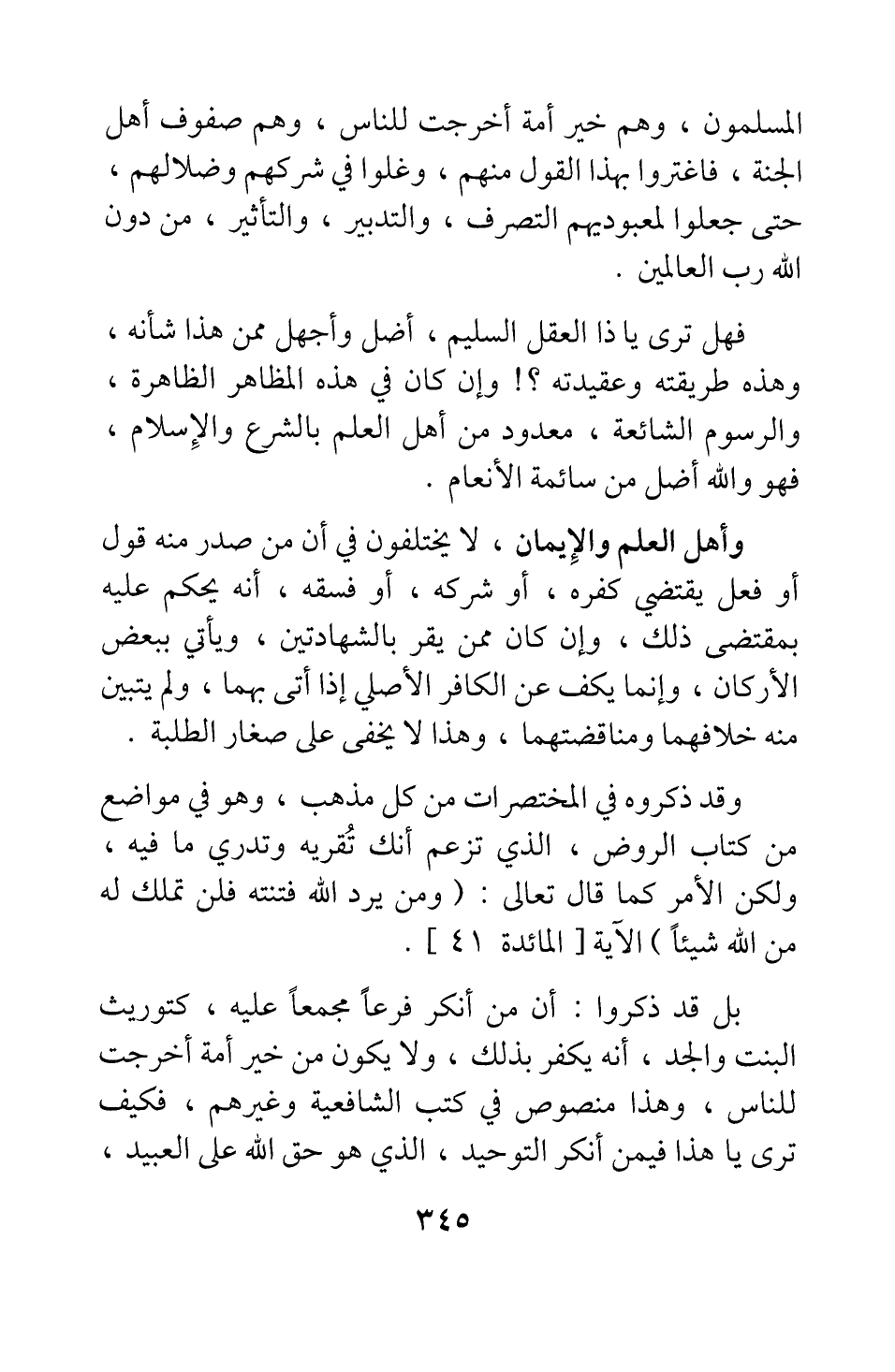 بل قد ذكروا أن من أنكر فرعا مجمعا عليه، كتوريث البنت والجد، أنه يكفر بذلك، ولا يكون من خير أمة أخرجت للناس؛ وهذا منصوص في كتب الشافعية وغيرهم، فكيف ترى يا هذا فيمن أنكر التوحيد، الذي هو حق الله على العبيد،