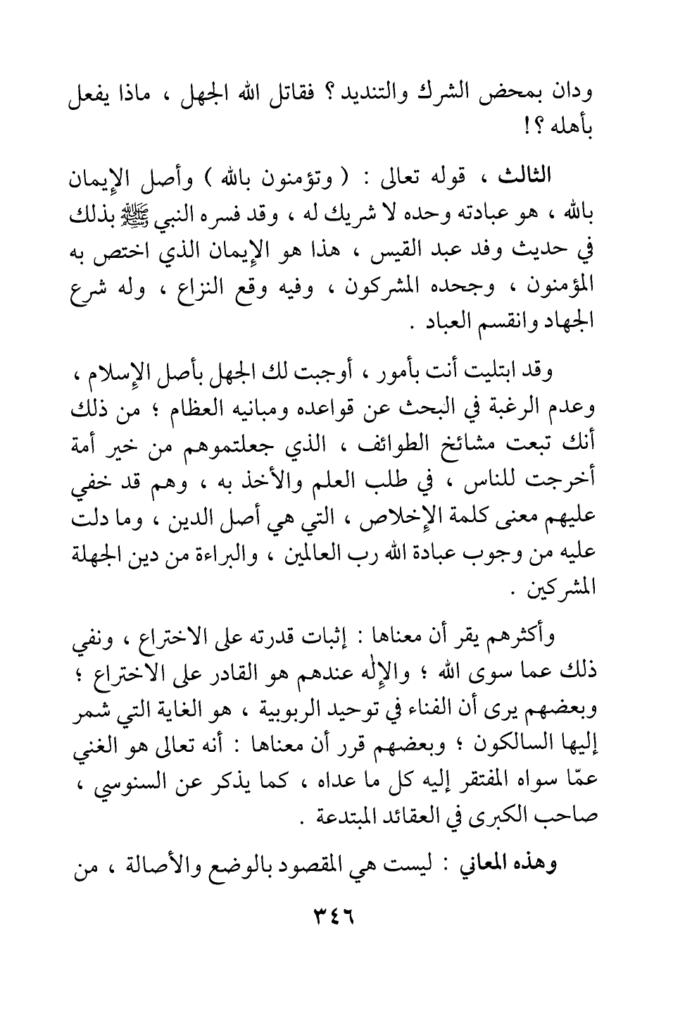 وقد ابتليت أنت بأمور، أوجبت لك الجهل بأصل الإسلام، وعدم الرغبة في البحث عن قواعده ومبانيه العظام ; من ذلك أنك تبعت مشايخ الطوائف، الذين جعلتموهم من خير أمة أخرجت للناس، في طلب العلم والأخذ به، وهم قد خفي عليهم معنى كلمة الإخلاص، التي هي أصل الدين، وما دلت عليه من وجوب عبادة الله رب العالمين، والبراءة من دين الجهلة المشركين.