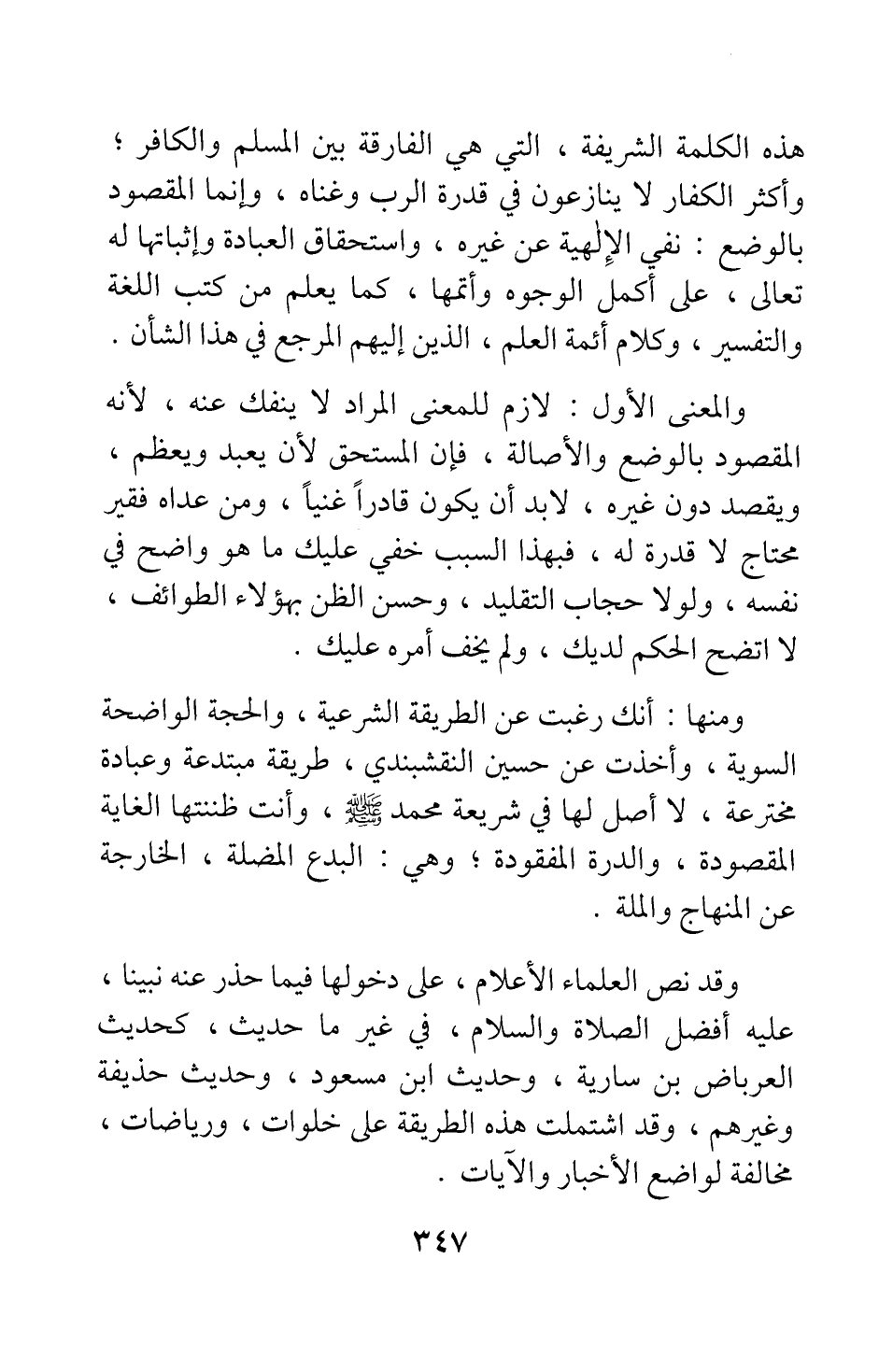 ومنها: أنك رغبت عن الطريقة الشرعية، والحجة الواضحة السوية، وأخذت عن حسين النقشبندي طريقة مبتدعة وعبادة مخترعة، لا أصل لها في شريعة محمد صلى الله عليه وسلم، وأنت ظننتها الغاية المقصودة، والدرة المفقودة ; وهي: البدع المضلة، الخارجة عن المنهاج والملة.