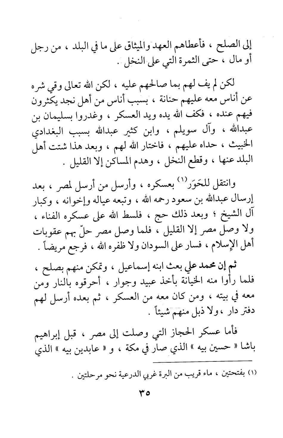 وانتقل للحور 1 بعسكره، وأرسل من أرسل لمصر، بعد إرسال عبد الله بن سعود رحمه الله، وتبعه عياله وإخوانه، وكبار آل الشيخ; وبعد ذلك حج، فسلط الله على عسكره الفناء، ولا وصل مصر إلا القليل. فلما وصل مصر حل بهم عقوبات أهل الإسلام، فسار على السودان ولا ظفره الله، فرجع مريضا.