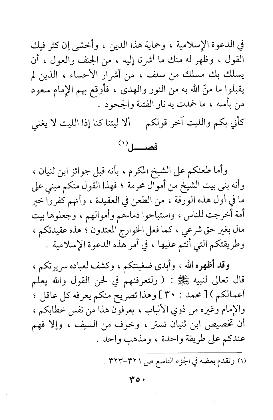 وقد أظهره الله، وأبدى ضغينتكم، وكشف لعباده سريرتكم، قال تعالى لنبيه صلى الله عليه وسلم: {وَلَتَعْرِفَنَّهُمْ فِي لَحْنِ الْقَوْلِ وَاللَّهُ يَعْلَمُ أَعْمَالَكُمْ} [سورة محمد آية: 30] . وهذا تصريح منكم يعرفه كل عاقل ; والإمام وغيره من ذوي الألباب، يعرفون هذا من نفس خطابكم، أن تخصيص ابن ثنيان تستر، وخوف من السيف، وإلا فهم عندكم على طريقة واحدة، ومذهب واحد.