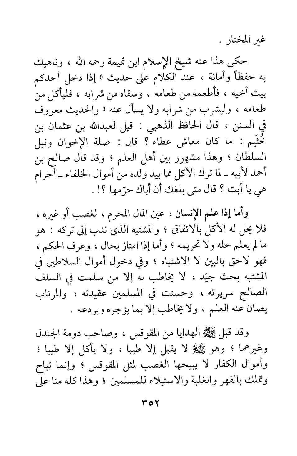 وأما إذا علم الإنسان، عين المال المحرم، لغصب أو غيره، فلا يحل له الأكل بالاتفاق؛ والمشتبه الذي ندب إلى تركه: هو ما لم يعلم حله ولا تحريمه ; وأما إذا امتاز بحال، وعرف الحكم، فهو لاحق بالبين لا الاشتباه; وفي دخول أموال السلاطين في المشتبه بحث جيد، لا يخاطب به إلا من سلمت في السلف الصالح سريرته، وحسنت في المسلمين عقيدته ; والمرتاب يصان عنه العلم، ولا يخاطب إلا بما يزجره ويردعه.