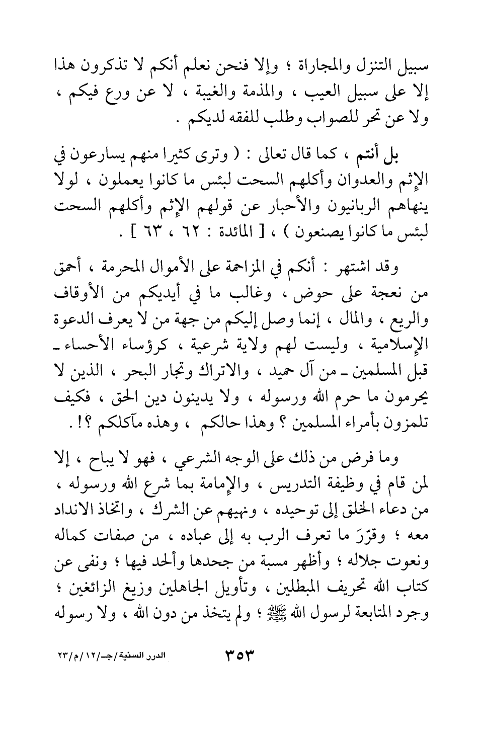 وقد اشتهر أنكم في المزاحمة على الأموال المحرمة، أحمق من نعجة على حوض؛ وغالب ما في أيديكم من الأوقاف والريع، والمال، إنما وصل إليكم من جهة من لا يعرف الدعوة الإسلامية، وليست لهم ولاية شرعية، كرؤساء الأحساء - قبل المسلمين - من آل حميد، والأتراك وتجار البحر، الذين لا يحرمون ما حرم الله ورسوله، ولا يدينون دين الحق، فكيف تلمزون بأمراء المسلمين، وهذا حالكم، وهذه مآكلكم؟!.