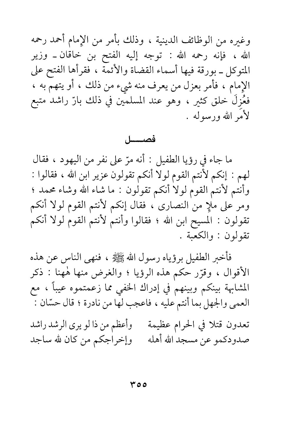 وغيره من الوظائف الدينية، وذلك بأمر من الإمام أحمد رحمه الله؛ فإنه رحمه الله توجه إليه الفتح ابن خاقان - وزير المتوكل - بورقة فيها أسماء القضاة والأئمة، فقرأها الفتح على الإمام، فأمر بعزل من يعرف منه شيء من ذلك، أو يتهم به، فعزل خلق كثير، وهو عند المسلمين في ذلك بار راشد متبع لأمر الله ورسوله.