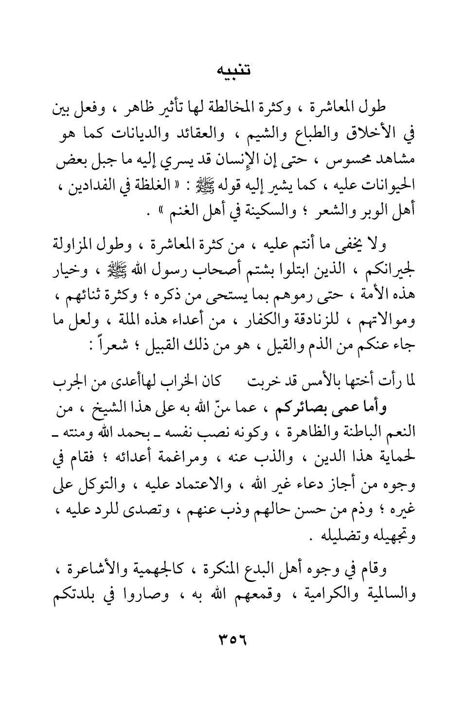 ولا يخفى ما أنتم عليه، من كثرة المعاشرة، وطول المزاولة لجيرانكم، الذين ابتلوا بشتم أصحاب رسول الله صلى الله عليه وسلم وخيار هذه الأمة، حتى رموهم بما يستحى من ذكره، وكثرة ثنائهم، وموالاتهم، للزنادقة والكفار، من أعداء هذه الملة؛ ولعل ما جاء عنكم من الذم والقيل، هو من ذلك القبيل ; شعرا: